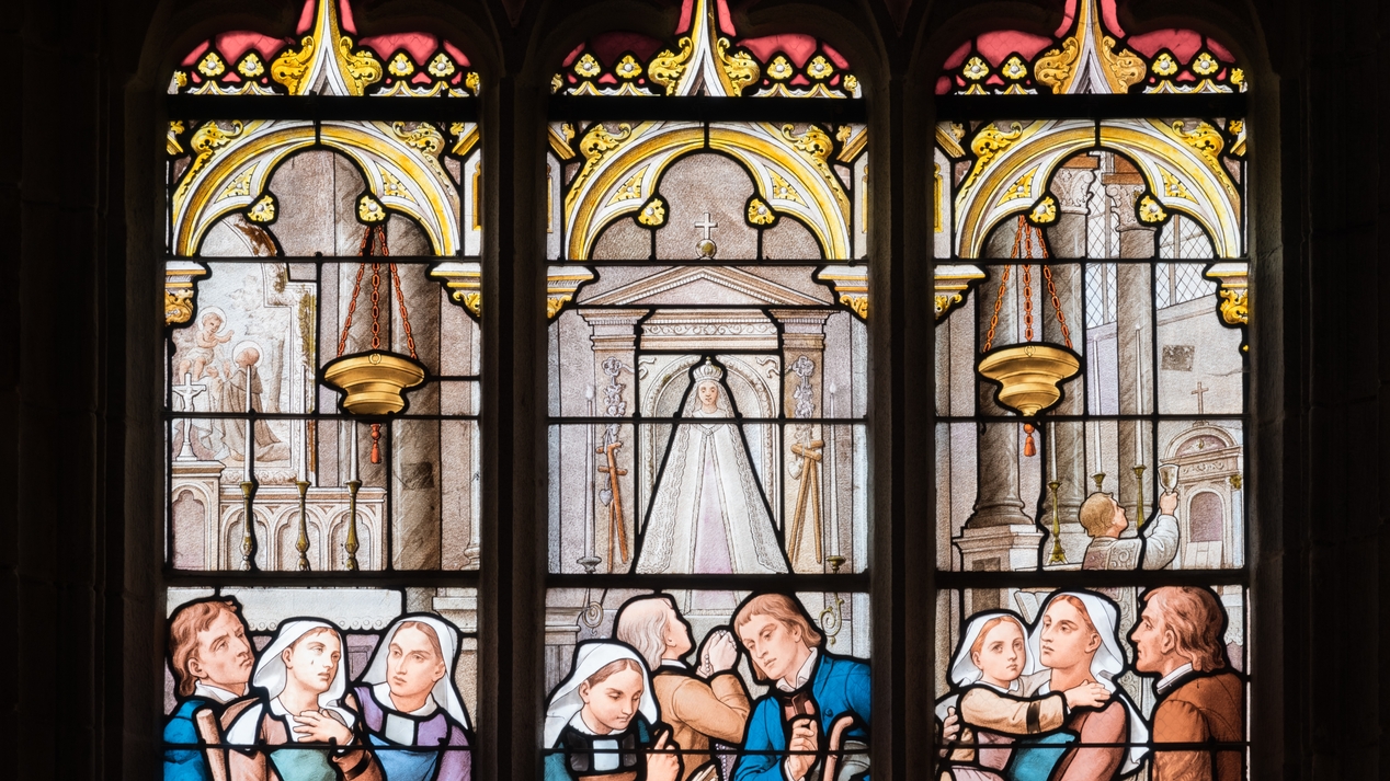 Verrière à personnages de la baie 11 : Guérison des enfants de Camors, basilique Notre-Dame-du-Roncier (Josselin),