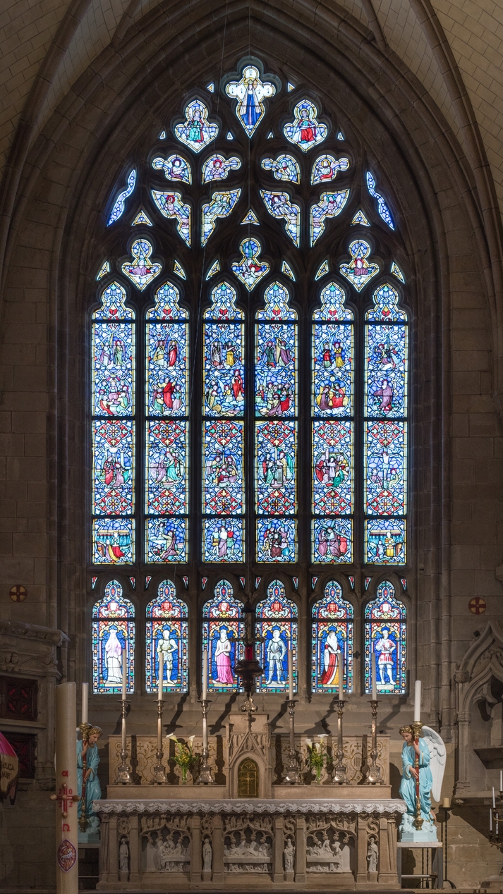Verrière à personnages de la baie 0 : Scènes de la vie de la Vierge, Passion du Christ, basilique Notre-Dame-du-Roncier (Josselin),