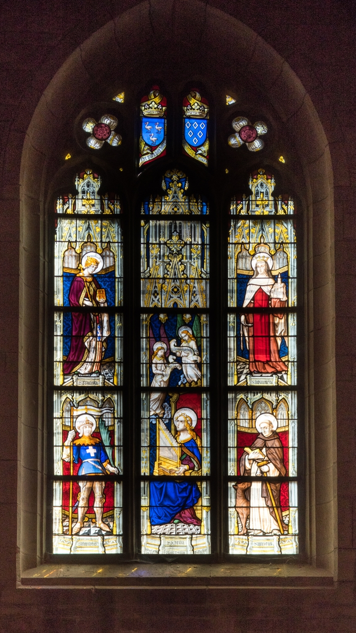 Verrière à personnages de la baie 12 : Sainte Françoise, saint Hippolyte, sainte Cécile, sainte Jeanne, Saint Hervé, basilique Notre-Dame-du-Roncier (Josselin),