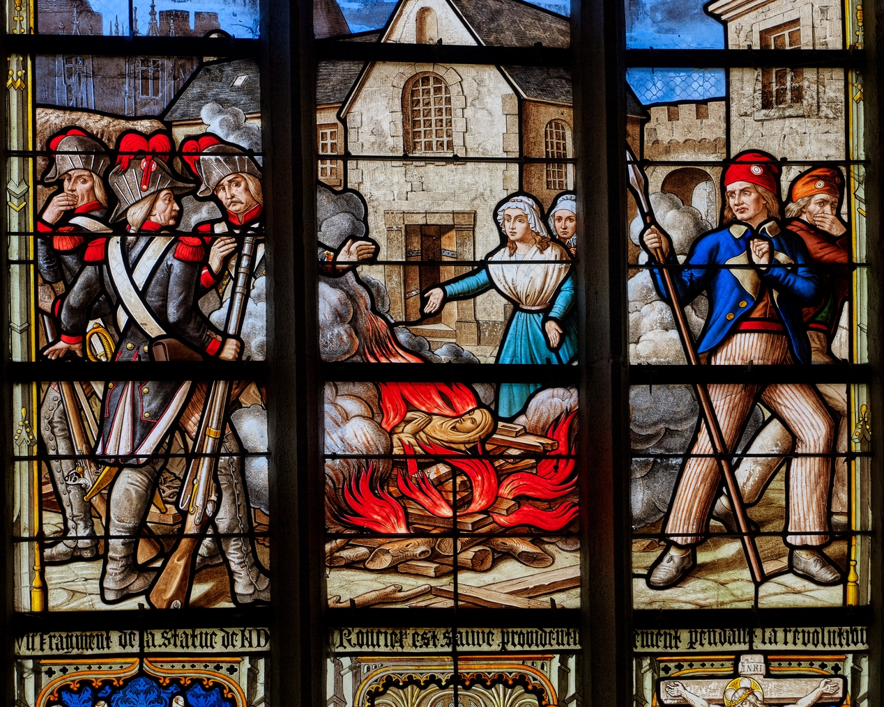 Verrière à personnages de la baie 13 : Un fragment de la statue de Notre-Dame du Roncier est sauvé providentiellement pendant la Révolution, basilique Notre-Dame-du-Roncier (Josselin),
