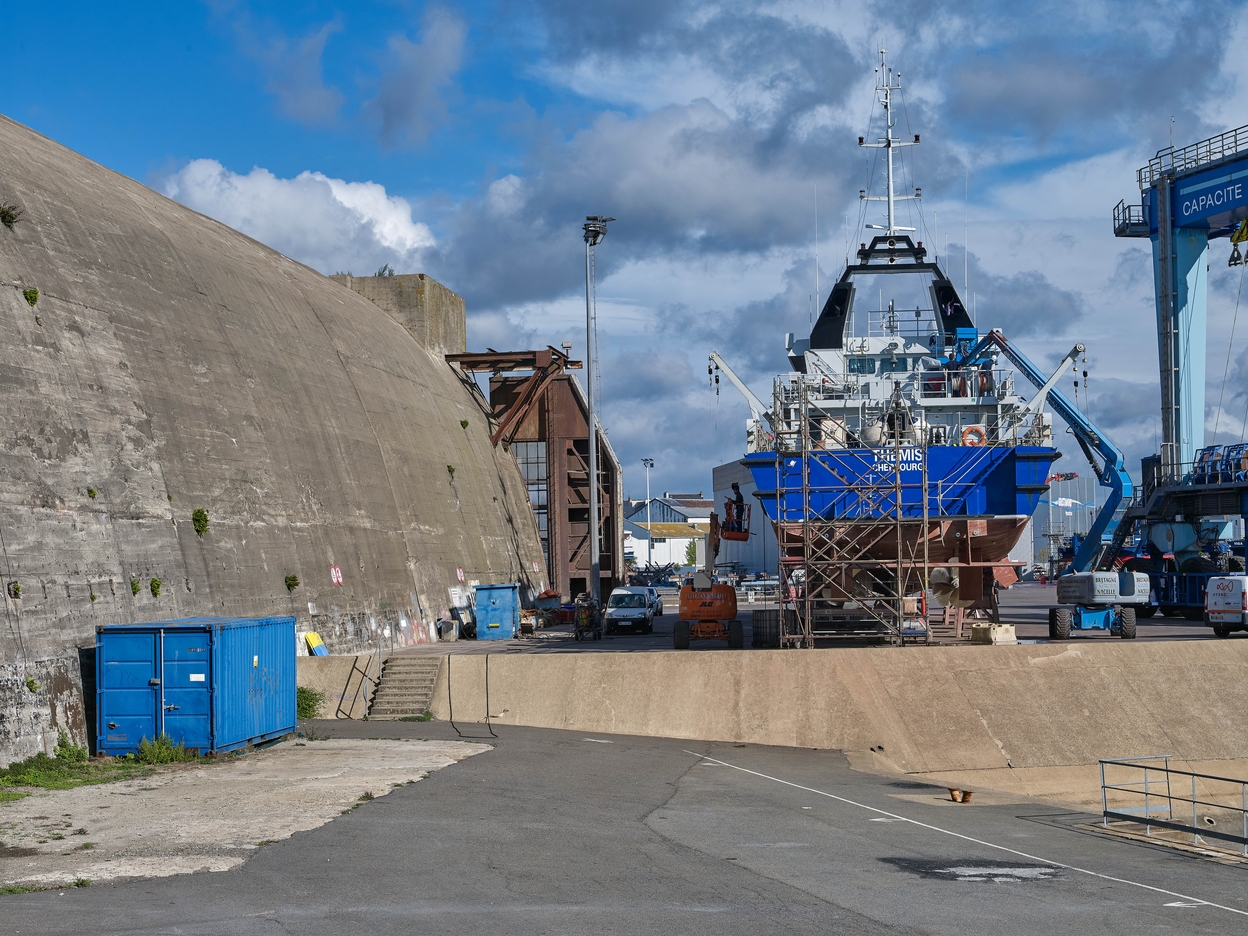 Dom-bunker Ouest dit "T6" avec encuvement pour canon antiaérien puis usine de construction navale, aire de réparation navale, port de pêche de Keroman (Lorient),