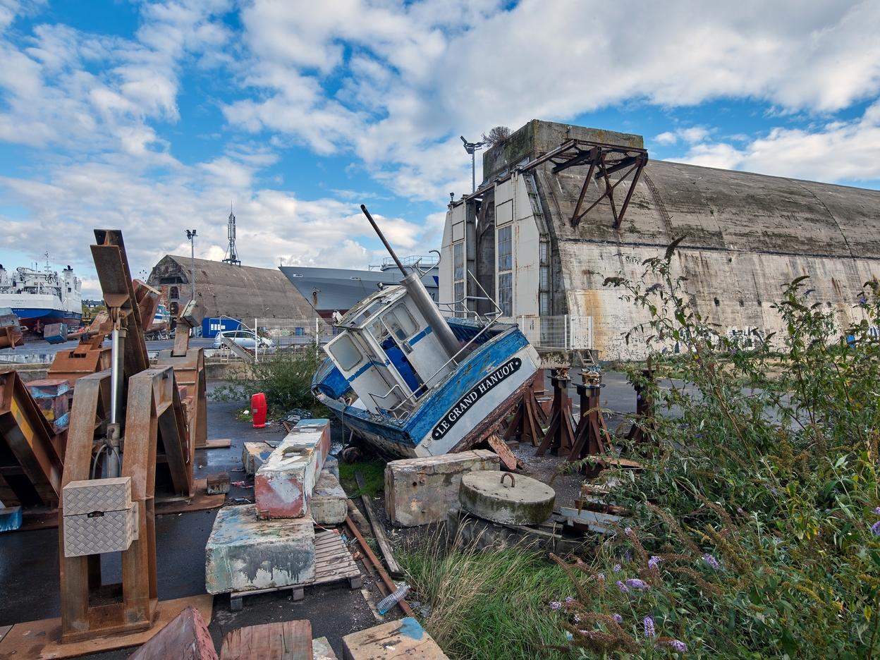 Dom-bunker Ouest dit "T6" avec encuvement pour canon antiaérien puis usine de construction navale, aire de réparation navale, port de pêche de Keroman (Lorient),
