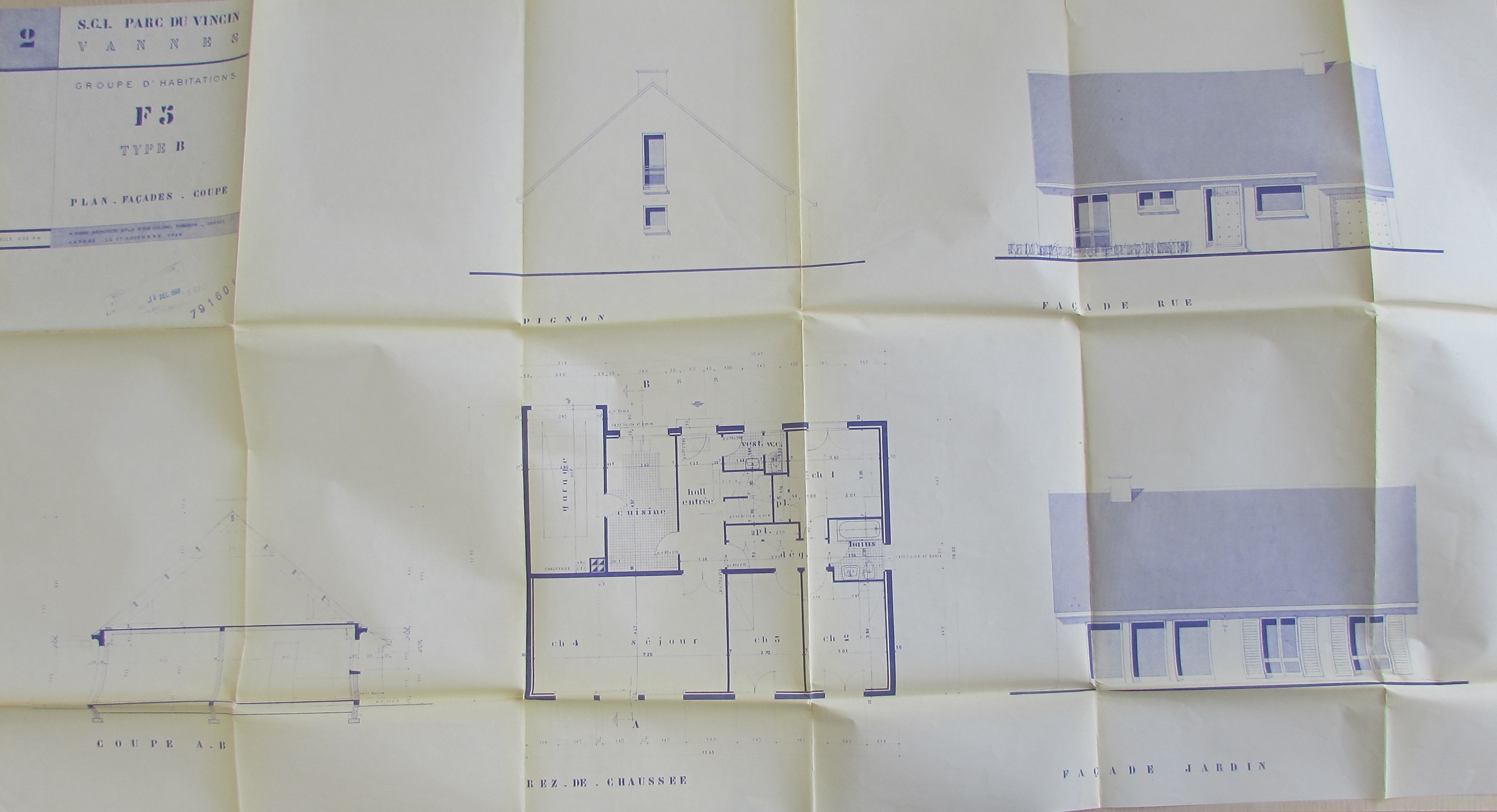 Plan, coupe, façades, maison F5 type B par M. Morin, 1968. AM Vannes 35 W 3867.Immatriculation