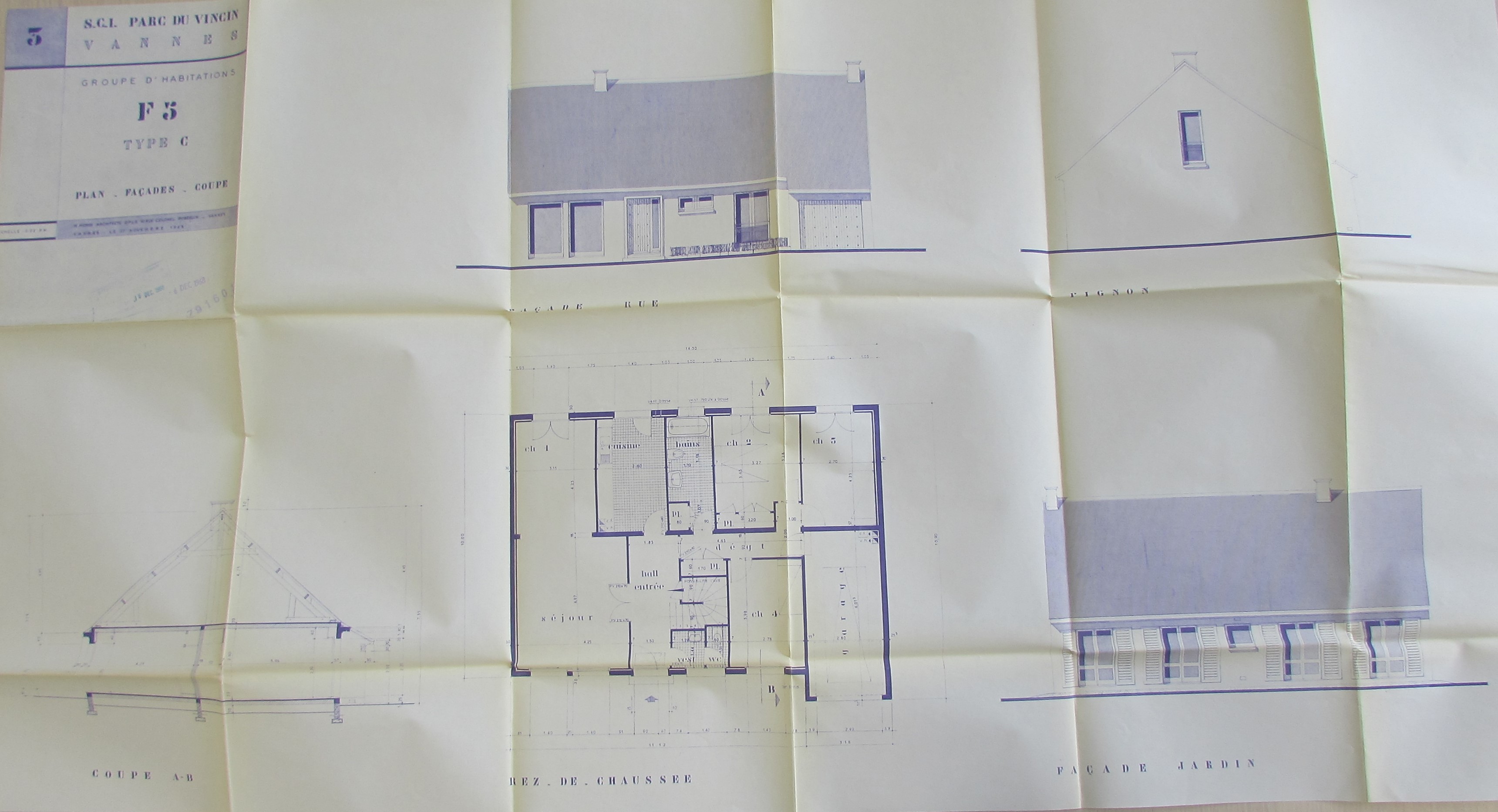 Plans, façades, coupe, maison F5 type C, 1968 par M. Morin. AM Vannes 35 W 3867.Immatriculation