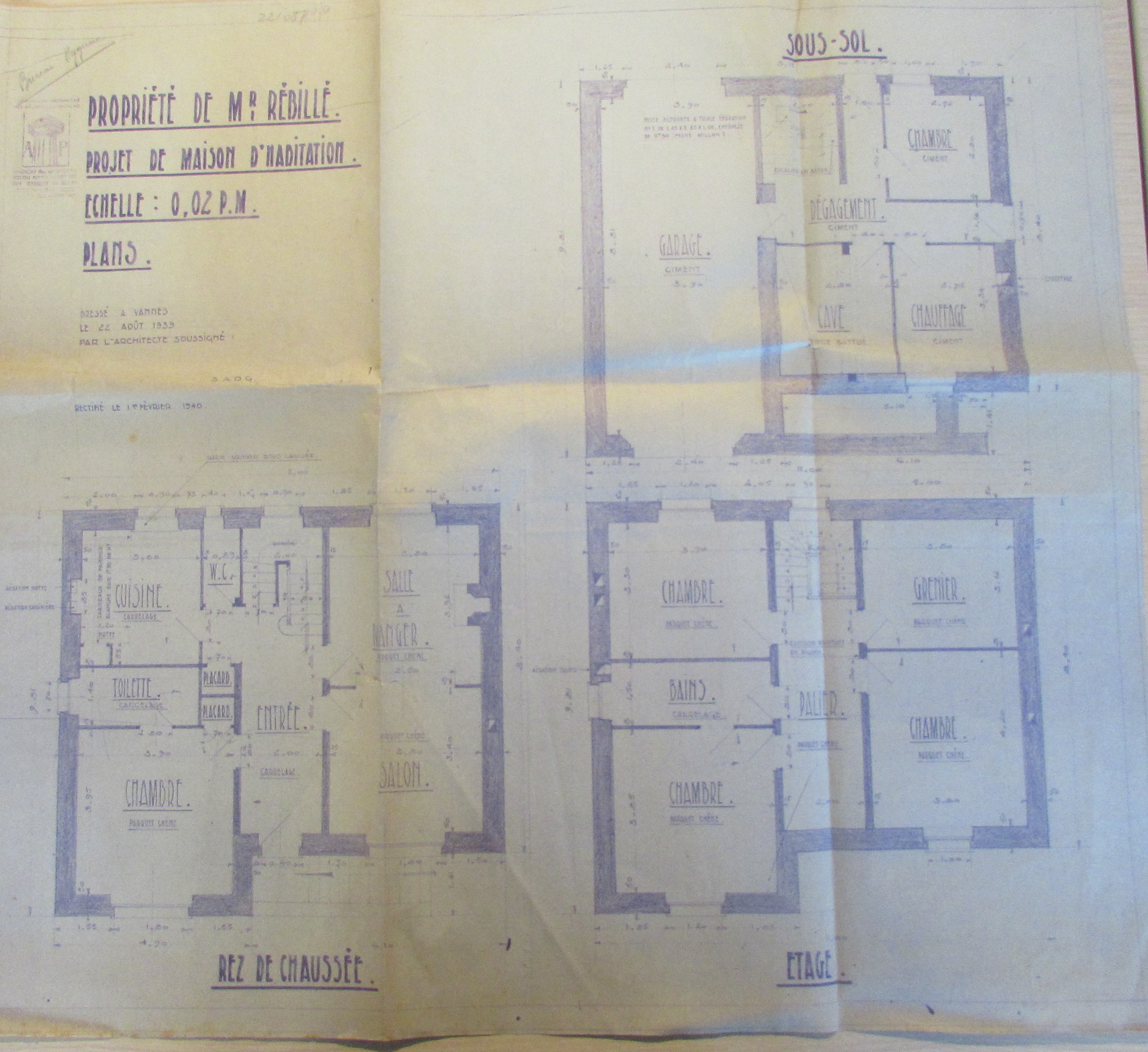 Projet de la maison Rébillé, plans au sol, 22 août 1939 par Guy Caubert de Cléry. AM Vannes 5 J 391.Immatriculation