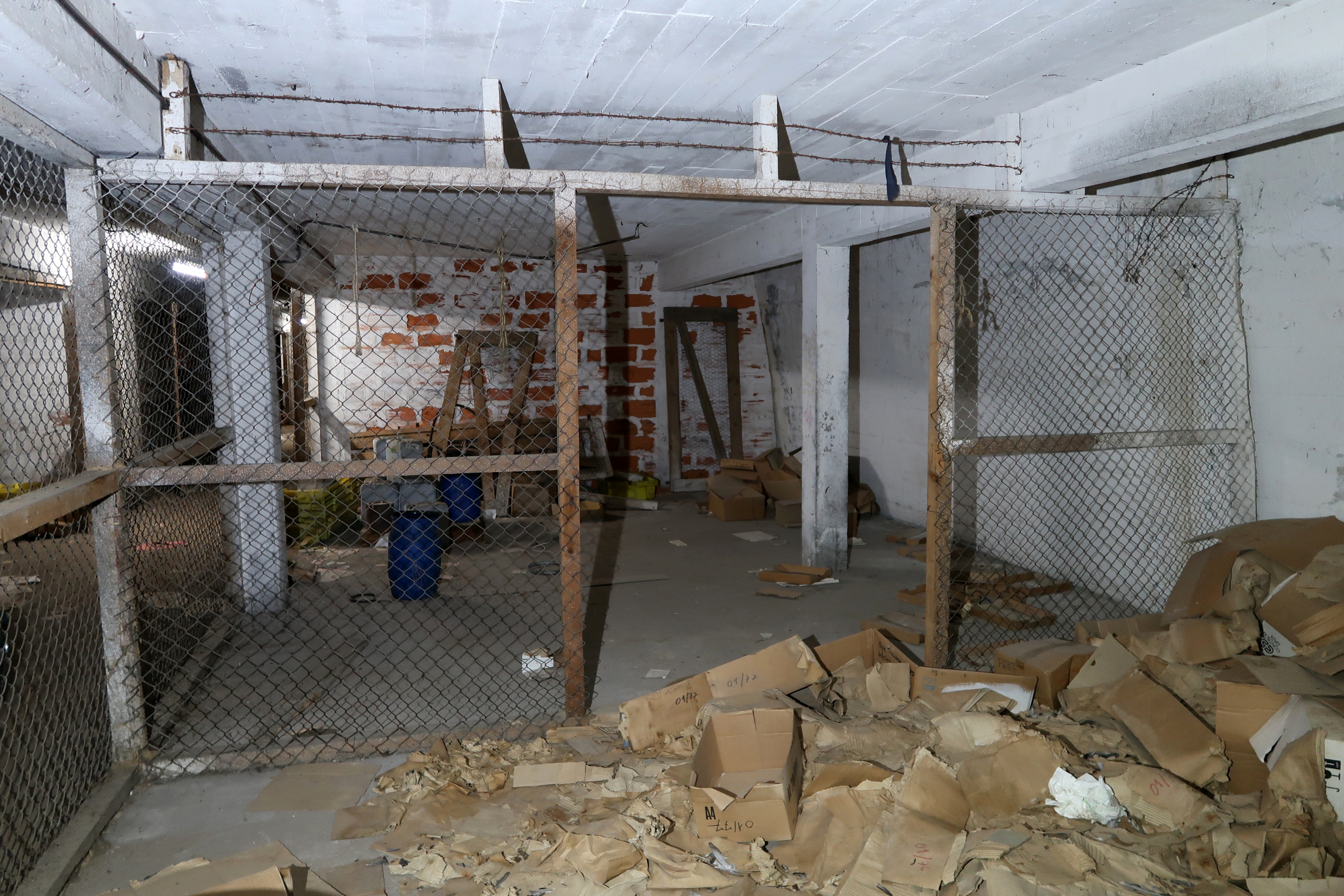 Premier étage : grillage surmonté de deux rangs de fil barbelé séparant deux boxes (box 28)Immatriculation