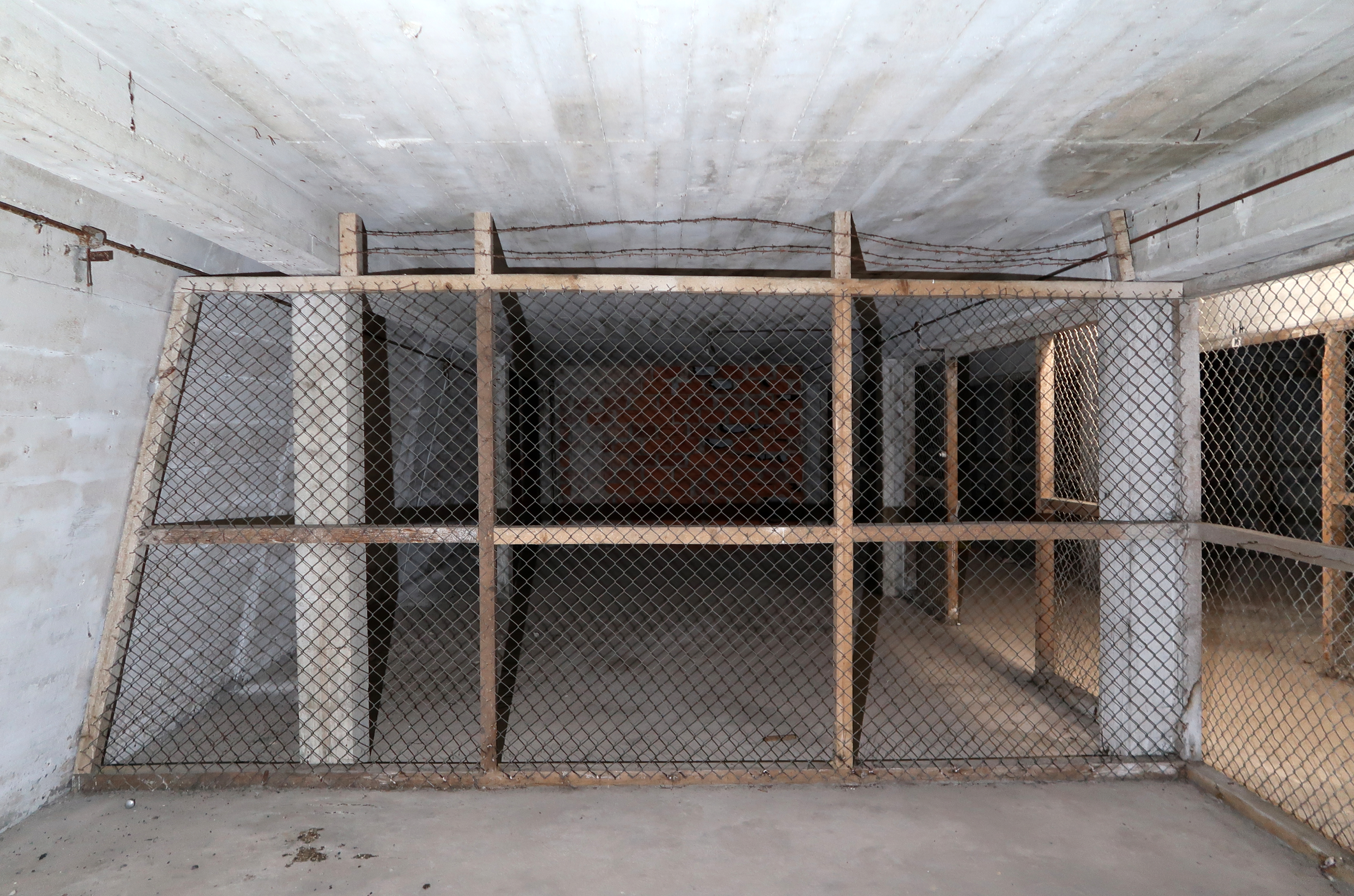 Deuxième étage : grillage surmonté de deux rangs de fil barbelé séparant deux boxesImmatriculation