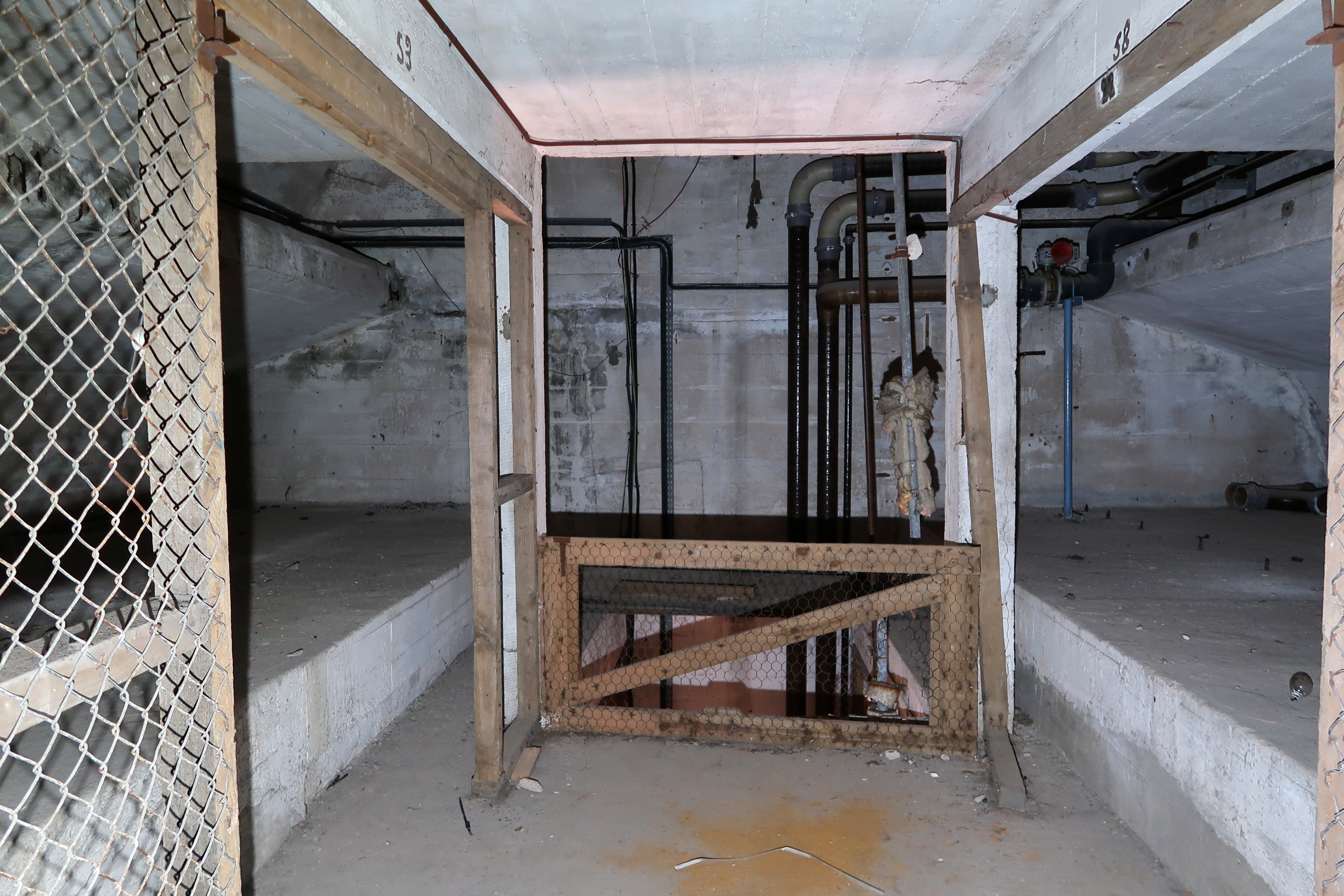 Troisième étage (quatrième niveau) : extrémité sud, couloir central desservant les boxes (boxes 53 et 58)Immatriculation