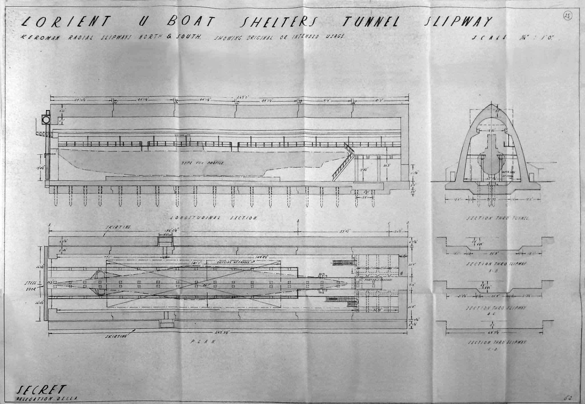 Plan et coupes avec un sous-marin type VII-C : "Lorient U Boat shelters tunnel slipway. Keroman radial slipways north and south. Showing original or intented usage. SECRET DELEGATION D.E.I.L.A." (Collection particulière ; source : Public Record Office, London ?)Immatriculation