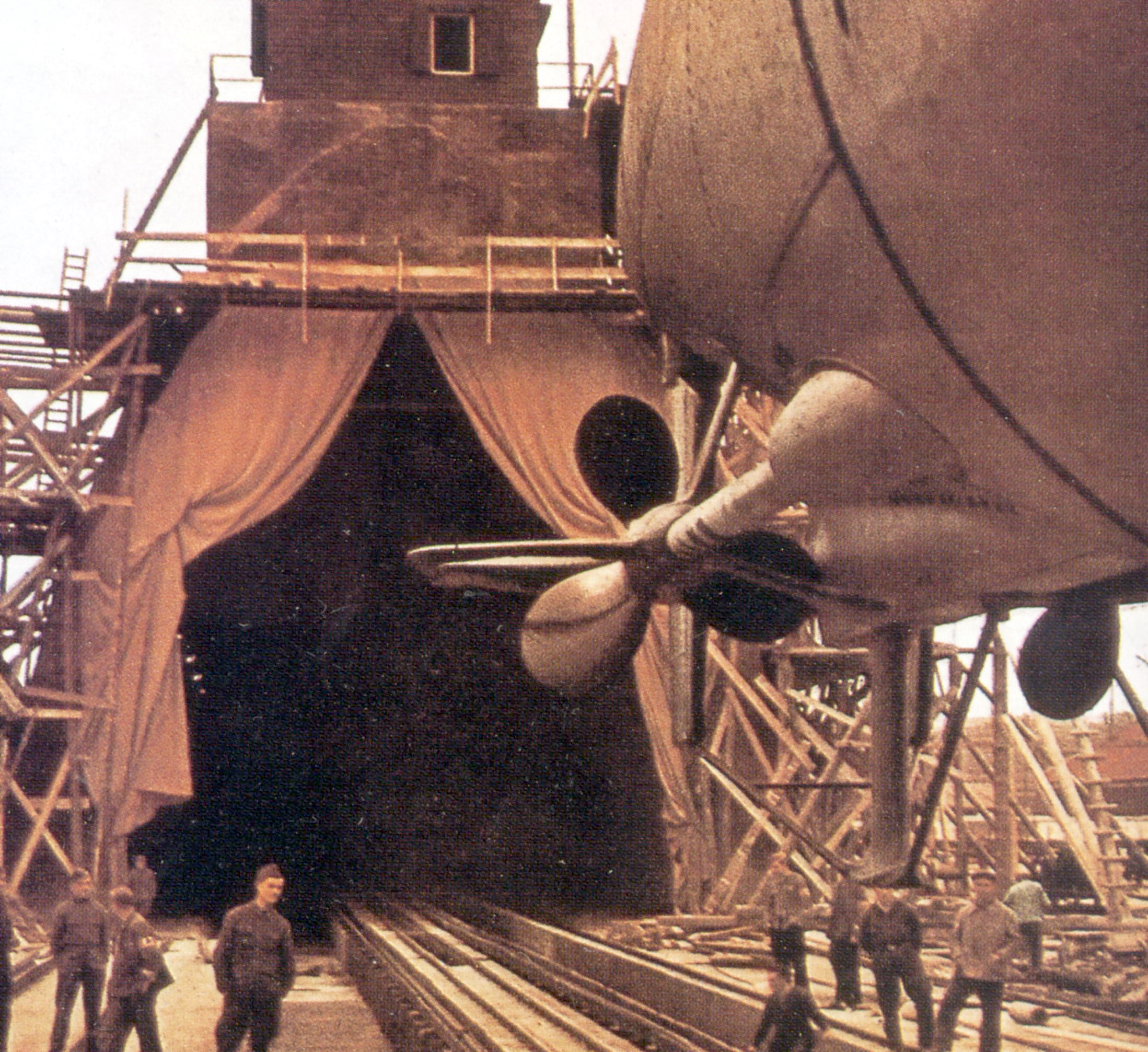 Vue générale du Dom-bunker Ouest depuis le nord avec un sous-marin de type VII-C sur chariot au premier plan à droite, mai 1941 (photographie publiée dans BRAEUER, Luc, 2008 ; illustration provenant vraisemblablement du journal de propagande "Signal" ?). La porte blindée du bunker n'est pas encore en place mais l'encuvement pour canon antiaérien a été couléImmatriculation