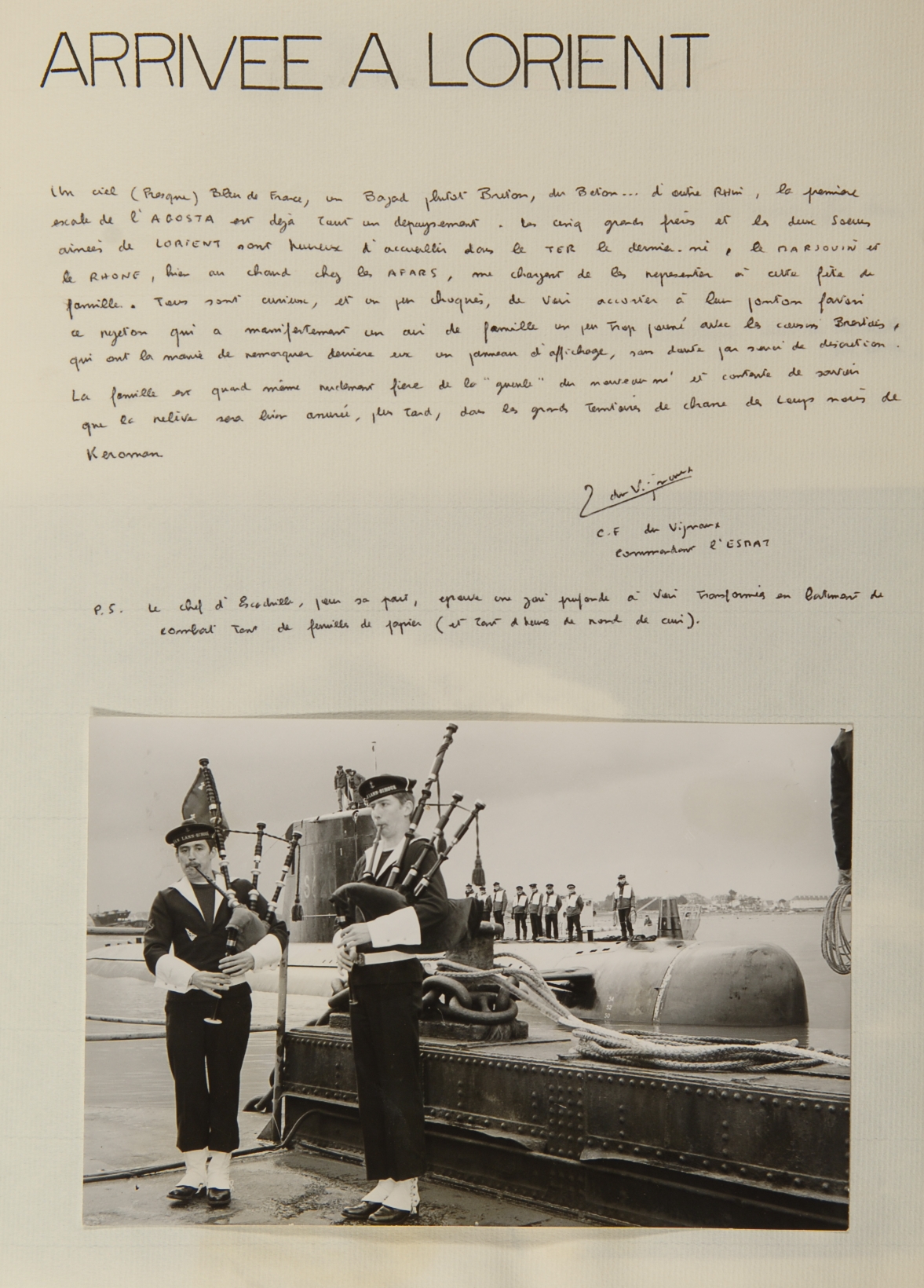 Première escale de l’Agosta à Lorient avec un bagad, 1975, extrait du livre d'or du sous-marin AgostaImmatriculation