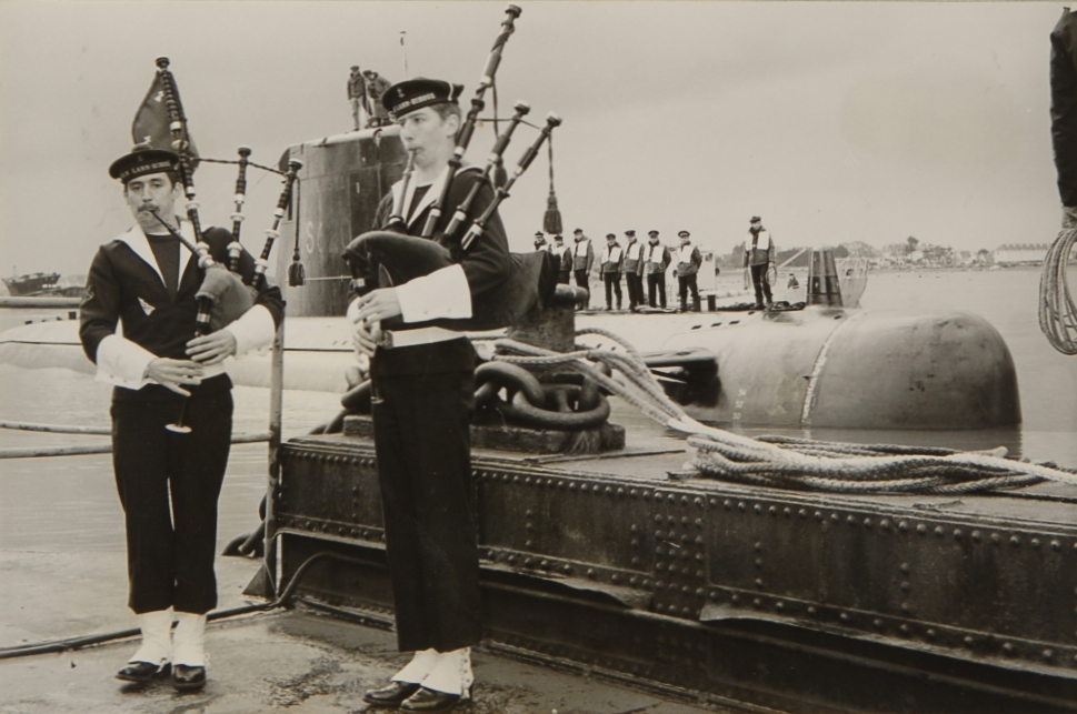 Première escale de l’Agosta à Lorient avec un bagad, 1975, extrait du livre d'or du sous-marin AgostaImmatriculation
