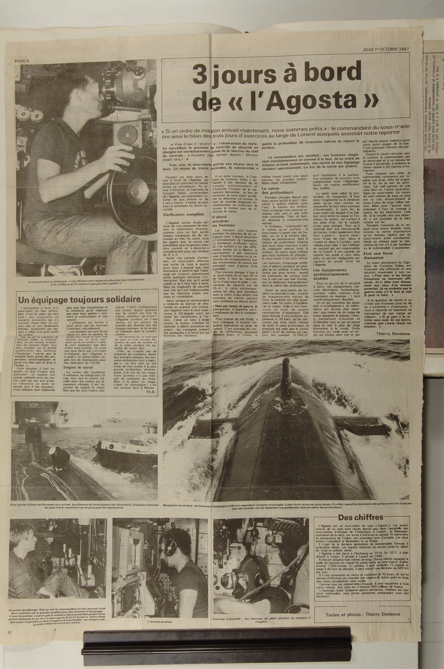 Revue de presse, "3 jours à bord de l'Agosta", 1er octobre 1987 (textes et photos : Thierry Devienne), extrait du livre d'or du sous-marin AgostaImmatriculation