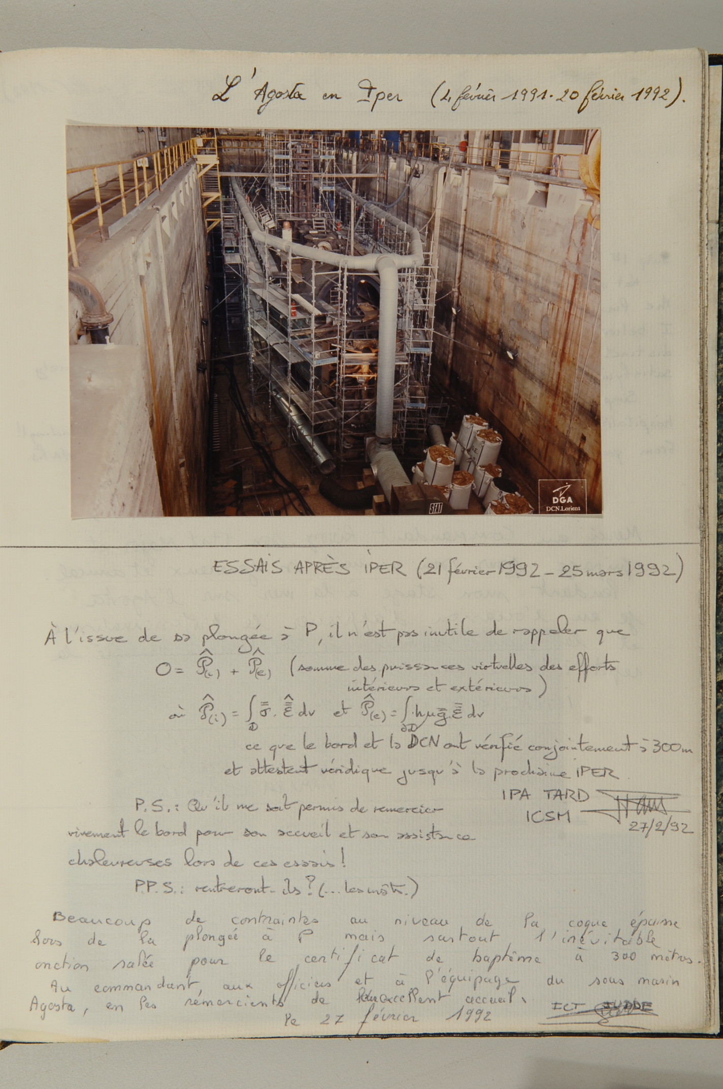 Le sous-marin Agosta dans l'alvéole A du bunker Keroman III à Lorient en indisponibilité périodique pour entretien et réparation - IPER (grand carénage), 1991-1992, extrait du livre d'or du sous-marin AgostaImmatriculation