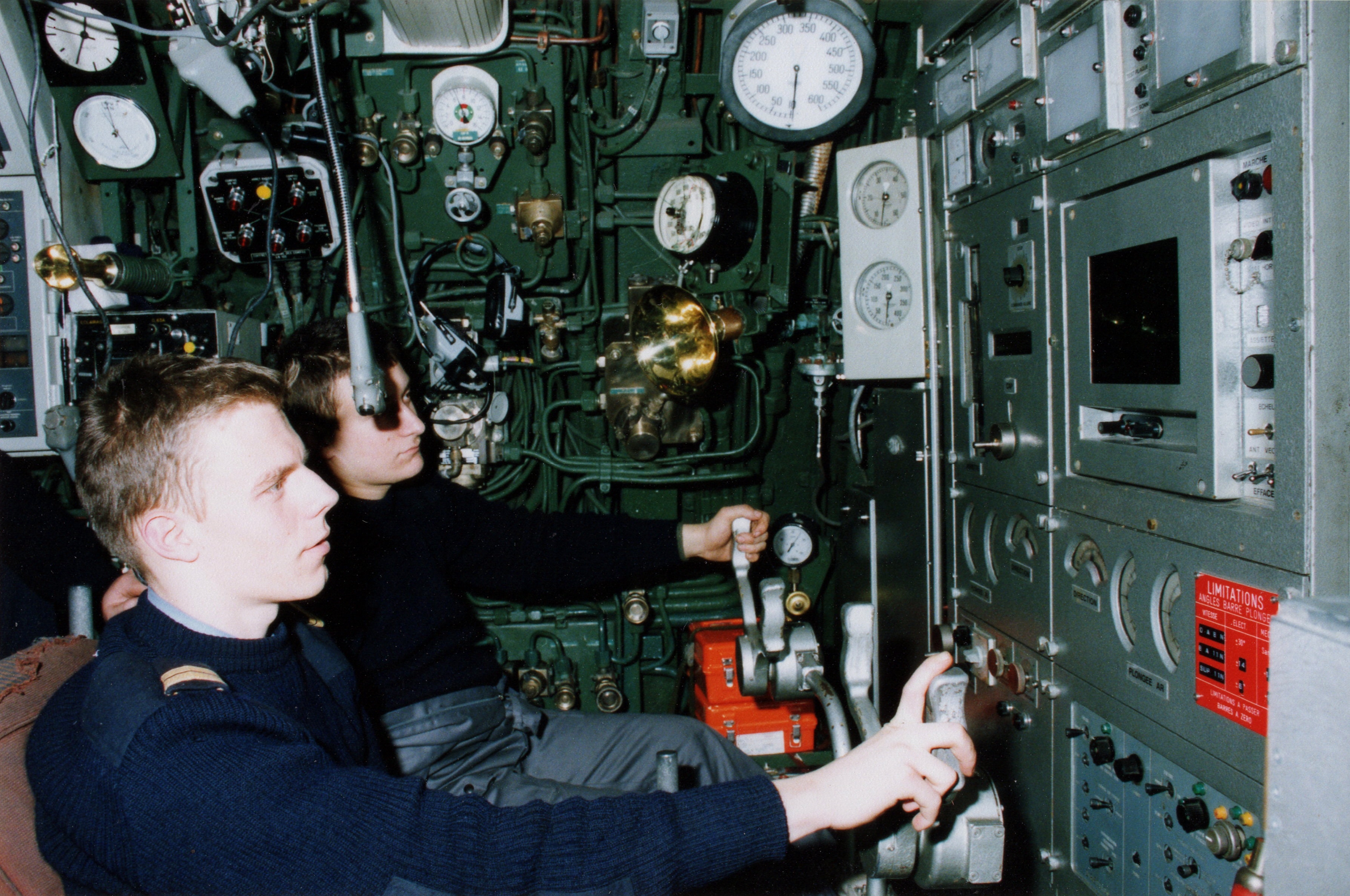 Barreurs du sous-marin Agosta dans le poste de pilotage, photographie non datéeImmatriculation