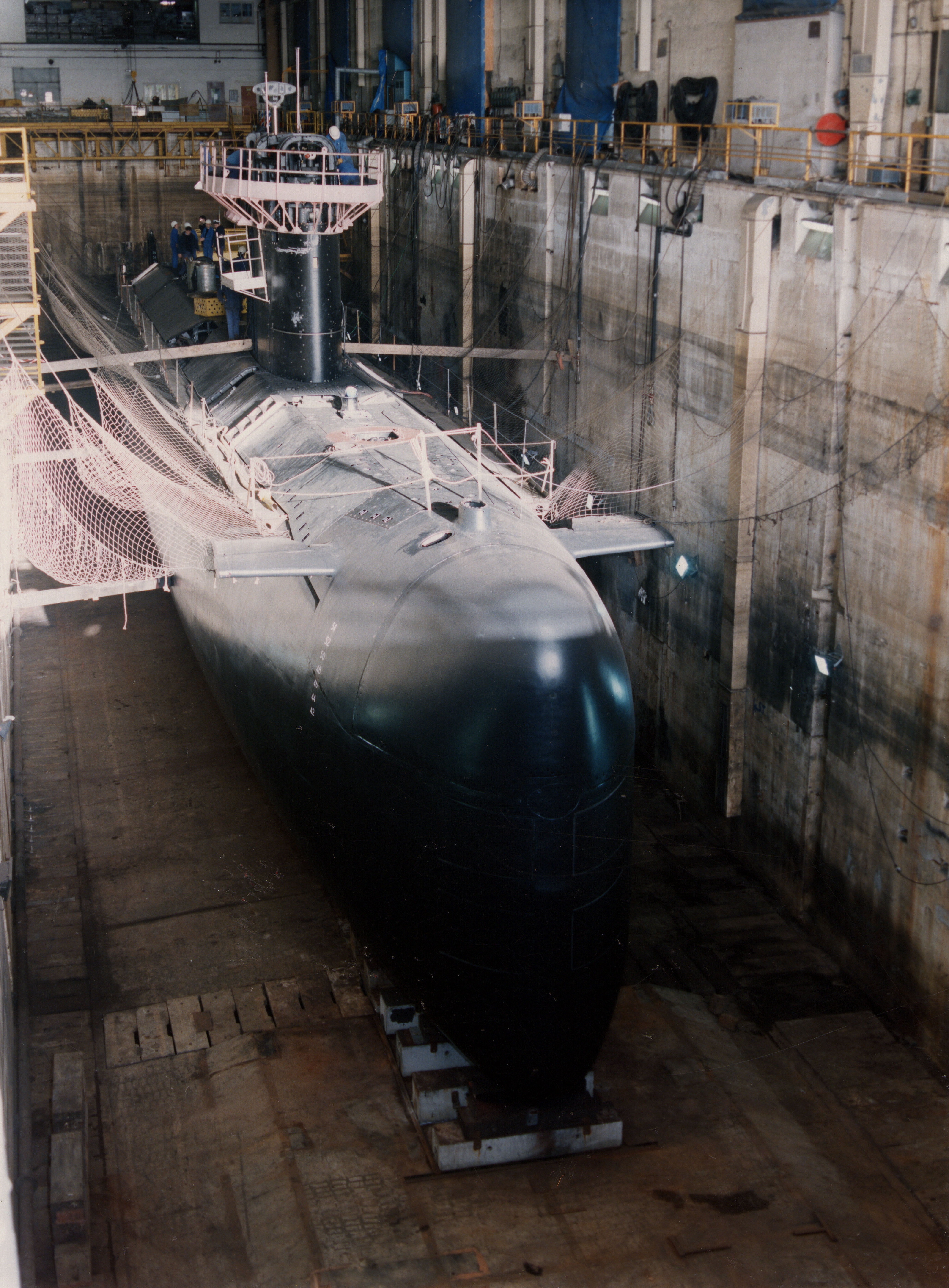 Vue du sous-marin Agosta en grand carénage dans l'alvéole A du bunker Keroman III à Lorient (1991-1992 ?)Immatriculation