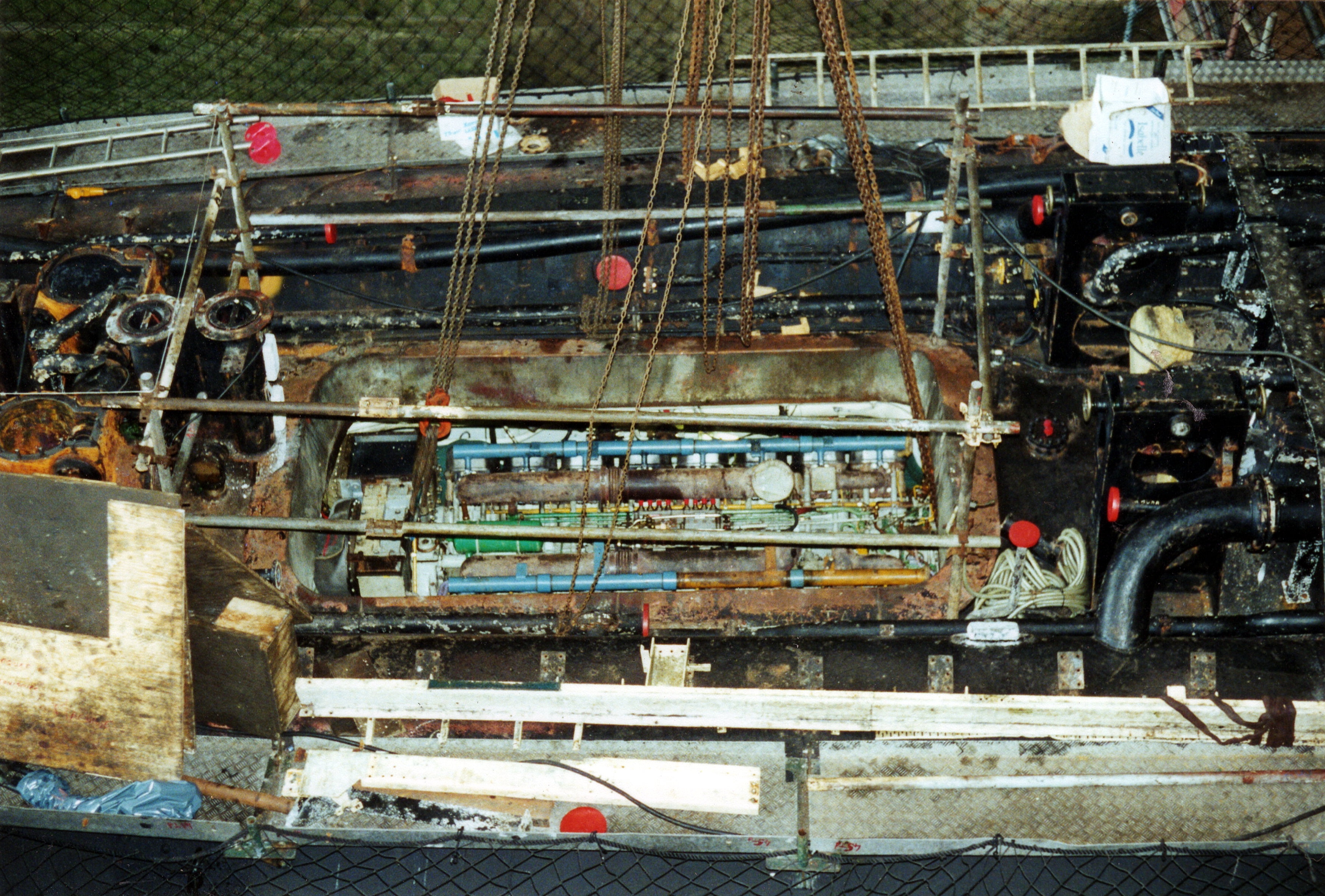 Vue du sous-marin Agosta en grand carénage : dépose et treuillage du moteur diesel par une brèche dans la coque, photographie non datée (1991-1992 ?)Immatriculation
