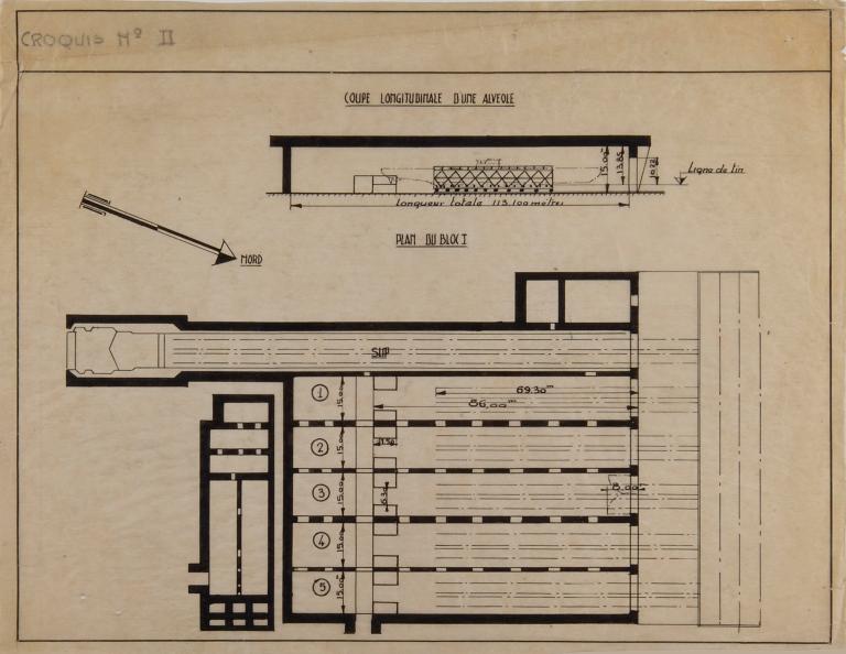 Plan et coupe longitudinale du bunker "KI", croquis II (Service Historique de la Défense de Lorient, Monographie de la base "Ingénieur Général Stosskopf", 1945-1946)Immatriculation