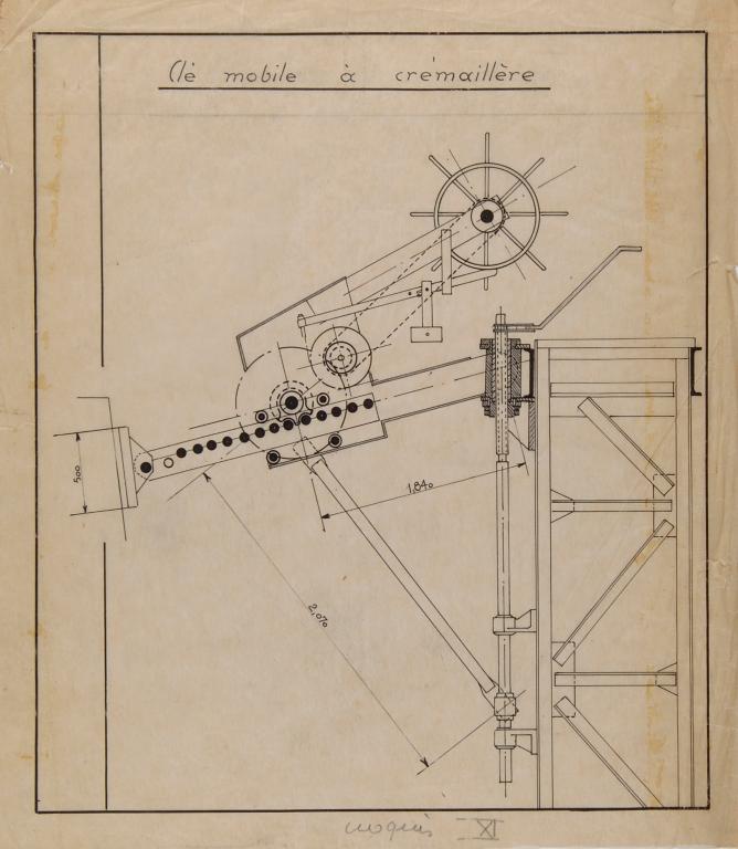 Coupe de la "clé mobile à crémaillère" du "berceau porte-bâtiments" (ber), croquis XI (Service Historique de la Défense de Lorient, Monographie de la base "Ingénieur Général Stosskopf", 1945-1946)Immatriculation