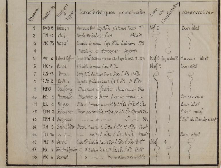 Liste et caractéristiques des machines-outils (marque et type) des ateliers des alvéoles n° 2, 3 et 4 du bunker "KI", rez-de-chaussée (Service Historique de la Défense de Lorient, Monographie de la base "Ingénieur Général Stosskopf", 1945-1946)Immatriculation