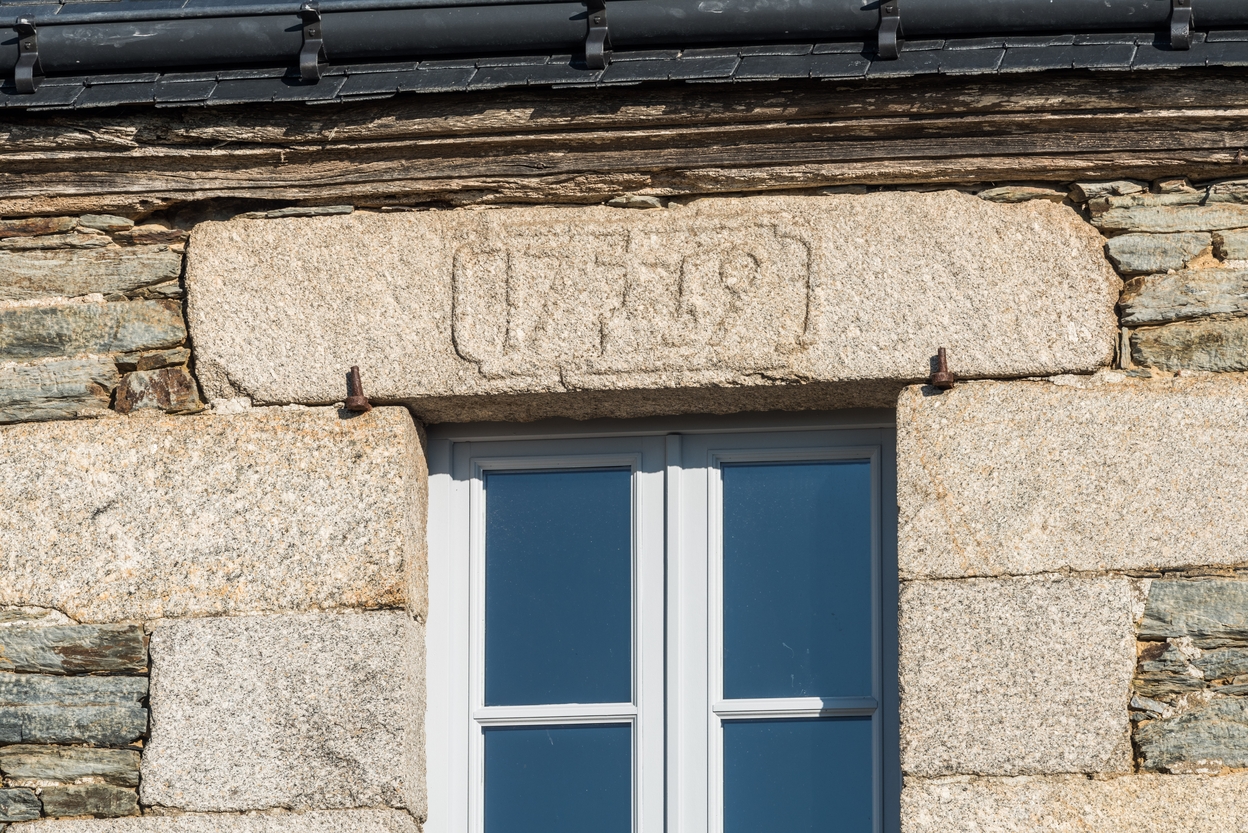 Maison abritant sous le même toit le logis et la pilerie. Façade ouest. Détail du linteau de fenêtre daté 1759Immatriculation