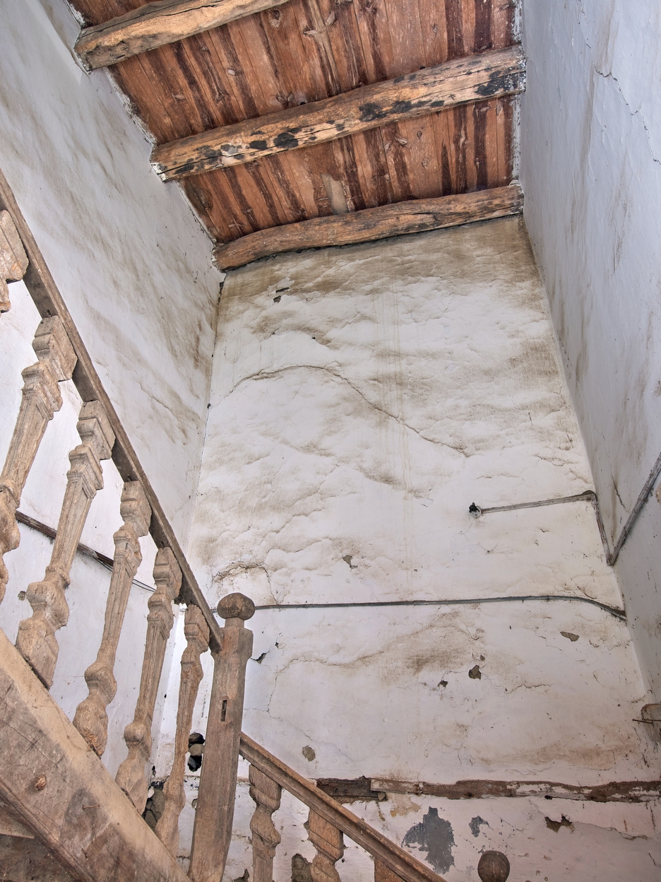 Cage d'escalier. Vue de la hauteur sous plafond.Immatriculation