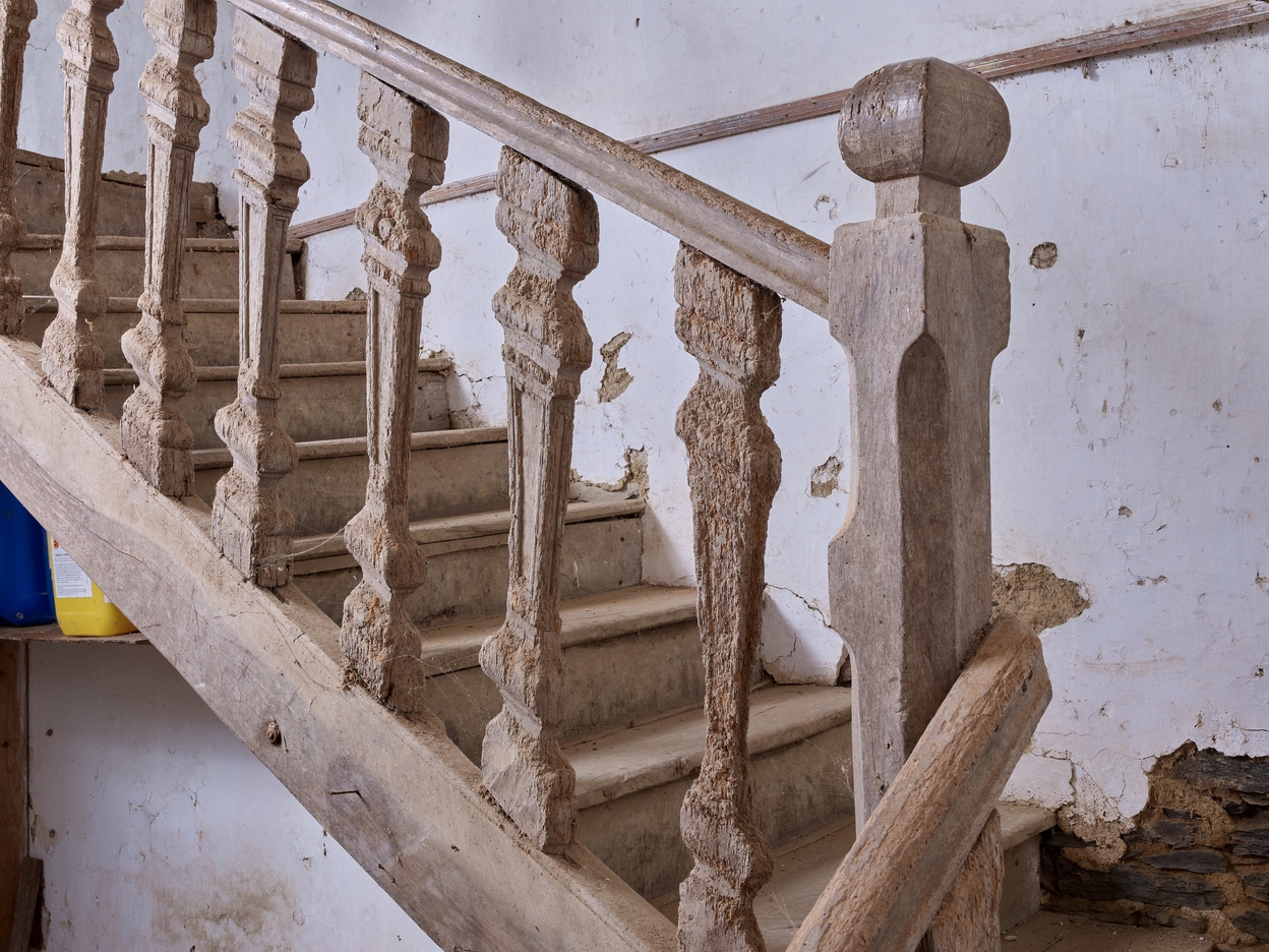 Escalier. Détail des balustres qui soutiennent la main courante.Immatriculation