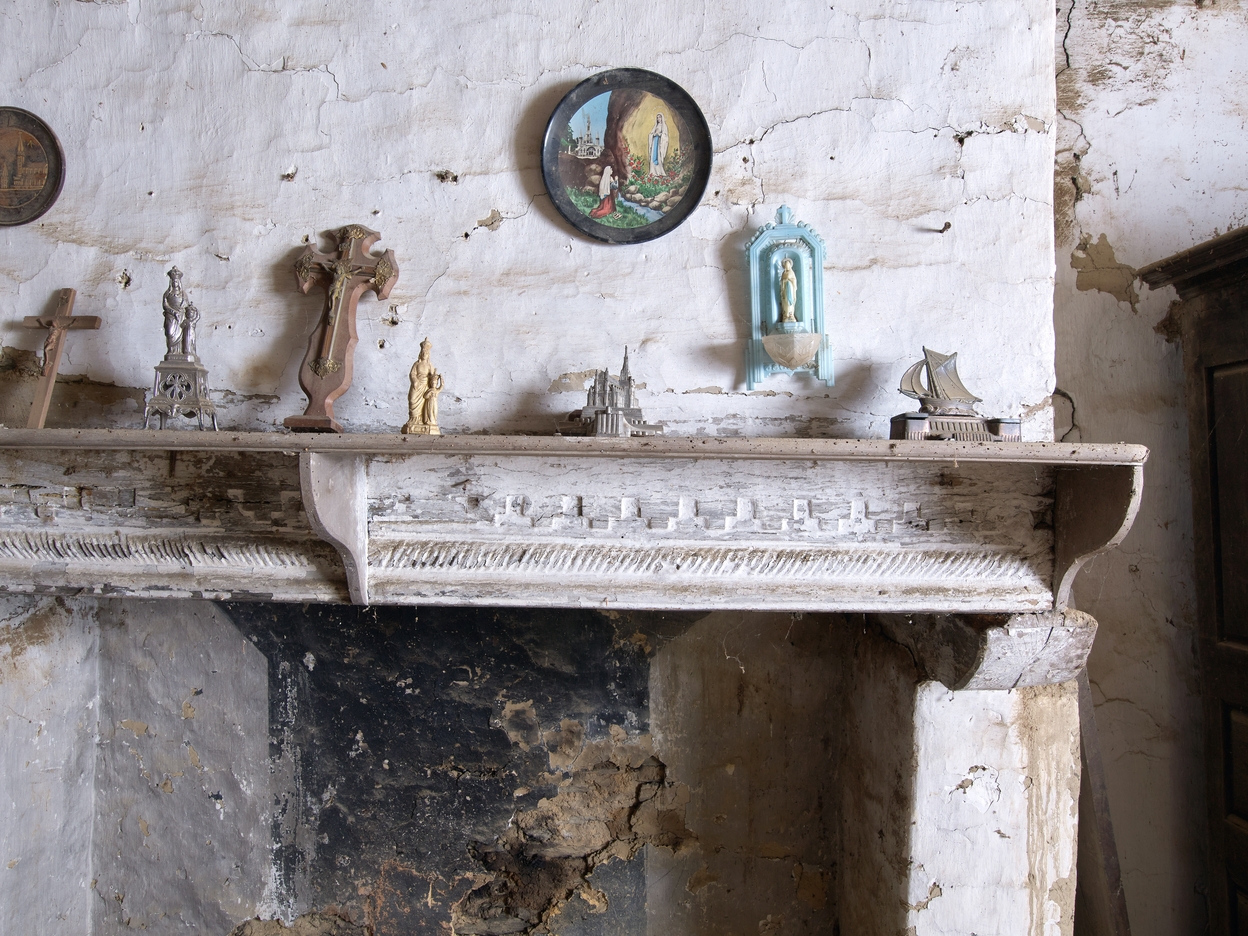 Chambre de l'étage. Cheminée. Détail du décor sculpté sur le linteau : godrons et motifs crénelés.Immatriculation