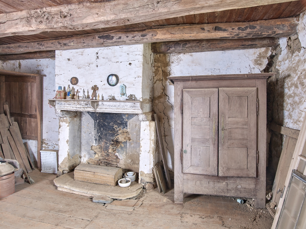 Chambre de l'étage. Cheminée encadrée par une armoire et un lit clos (vestiges)Immatriculation