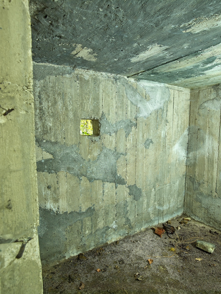 Vue de l'un des deux postes d'observation et de tir. Il est doté d'une petite ouverture de forme carrée destinée à l'utilisation d'un fusil ou d'une arme automatiqueImmatriculation