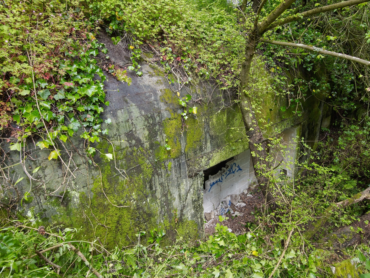 Vue arrière du bunker et de son entrée (partiellement murée par des parpaings). Le bunker est envahi par la végétationImmatriculation