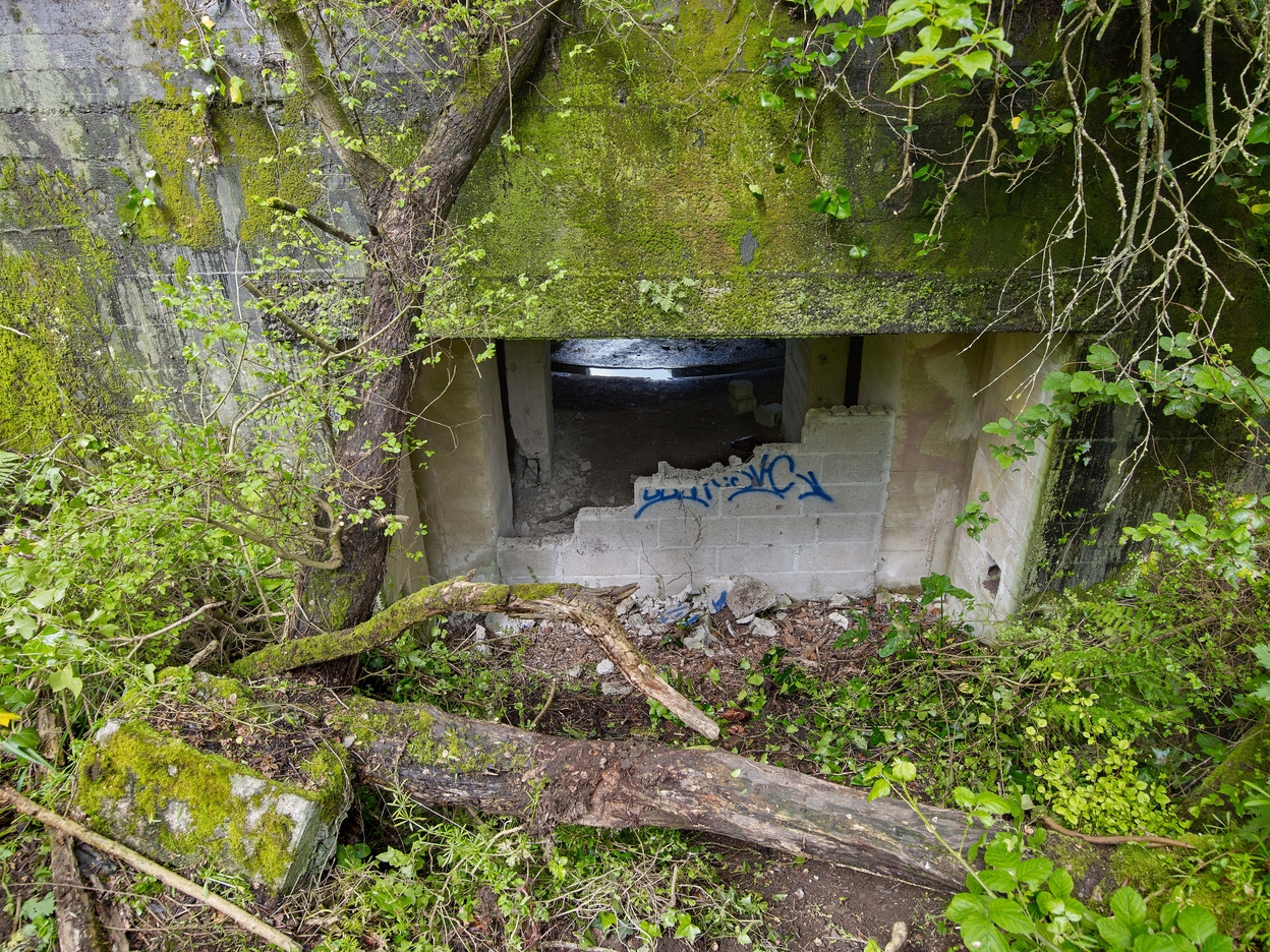 Vue du bunker - casemate de type 612 pour un canon de campagne ou obusier de 7,62 cm ou 10,5 cm situé à l'extrémité Est de la pointe : entrée (photographiée de l'extérieur). L'entrée du bunker est partiellement murée par des parpaingsImmatriculation