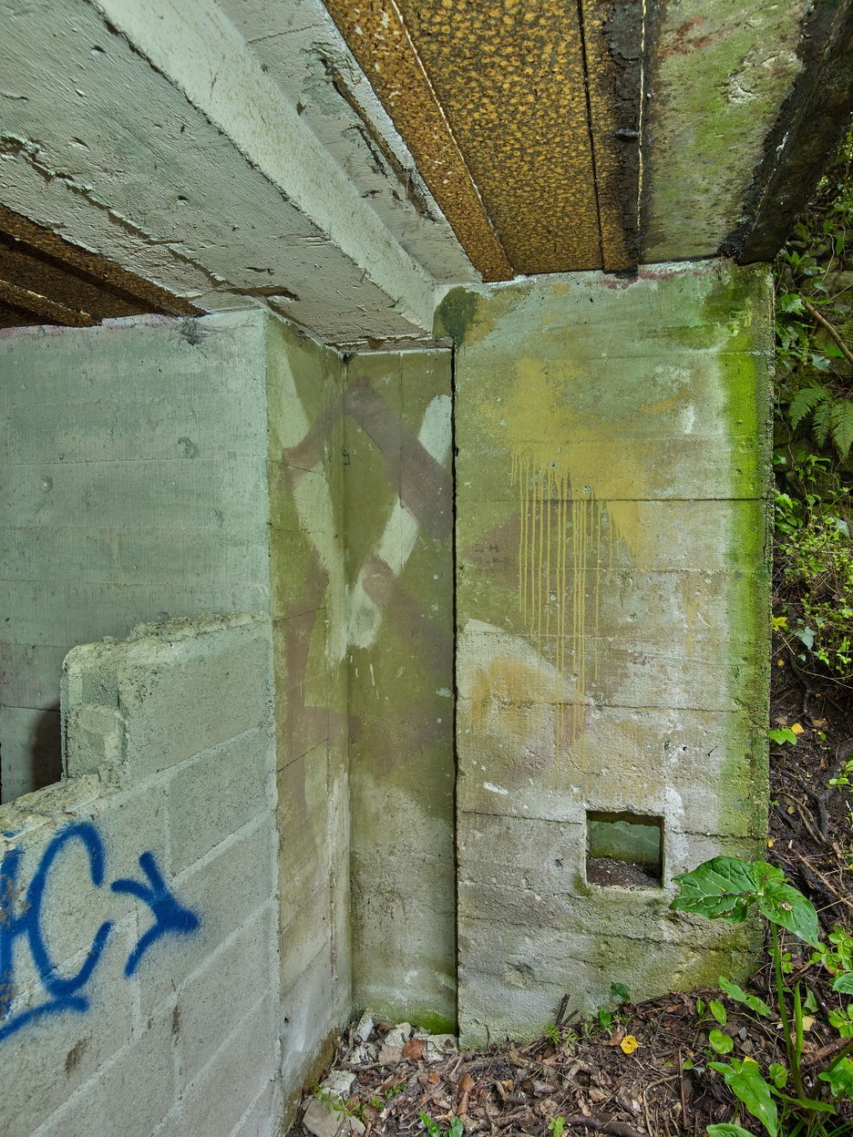 Vue de l'entrée (partiellement murée par des parpaings) : sur le mur Est, traces de peinture camouflageImmatriculation