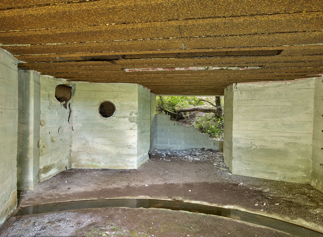 Vue du bunker - casemate de type 612 pour un canon de campagne ou obusier de 7,62 cm ou 10,5 cm situé à l'extrémité Est de la pointe : entrée (photographiée de l'intérieur). L'entrée du bunker est partiellement murée par des parpaingsImmatriculation