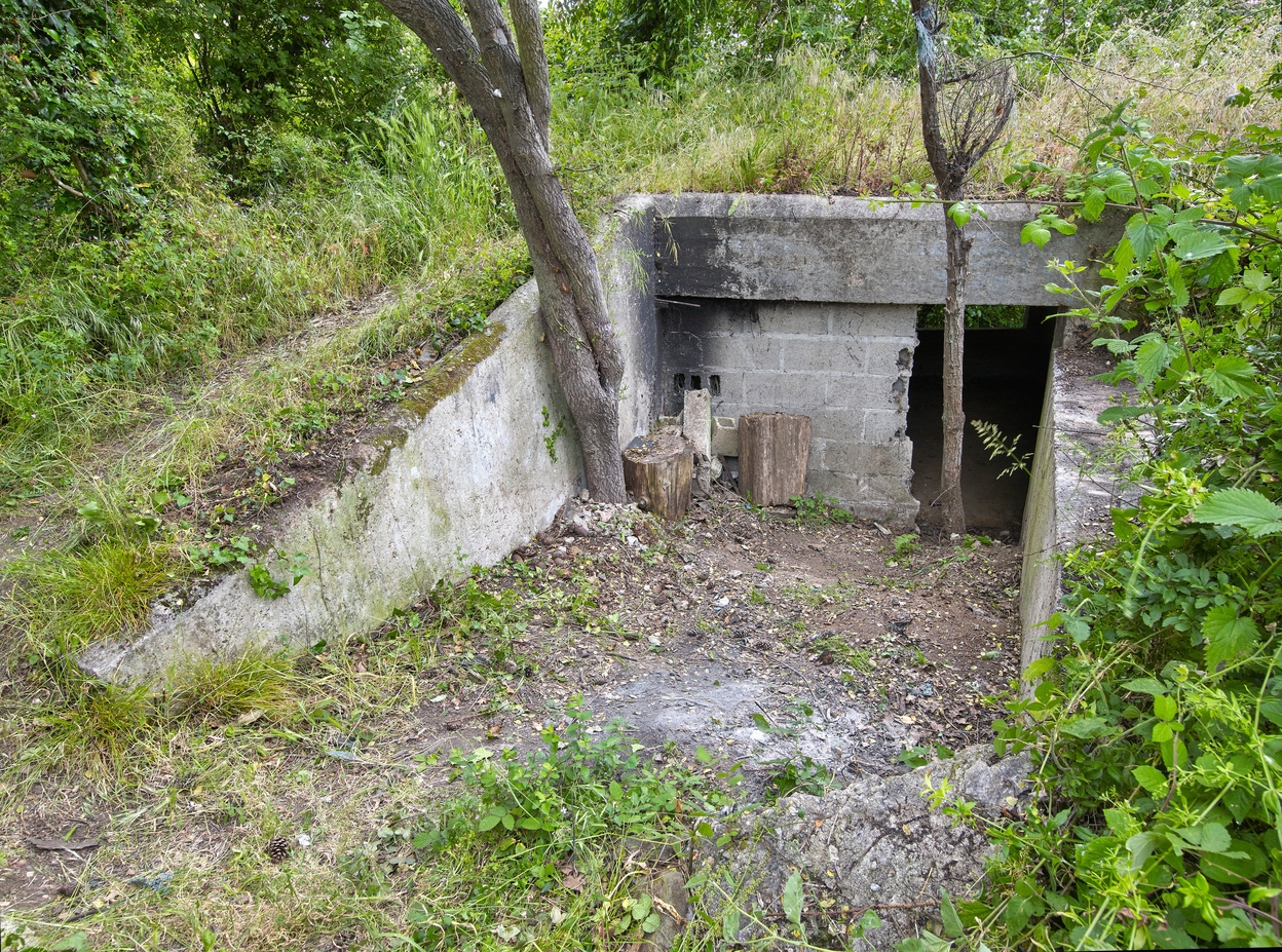 Vue du bunker - casemate de type VF pour un canon de 50 mm situé à l'extrémité Est de la pointe : entrée et rampe d'accès. Les murs latéraux protégent l'entrée qui était camouflée par un filet. L'entrée est partiellement murée par des parpaings et la chambre de tir est remblayéeImmatriculation