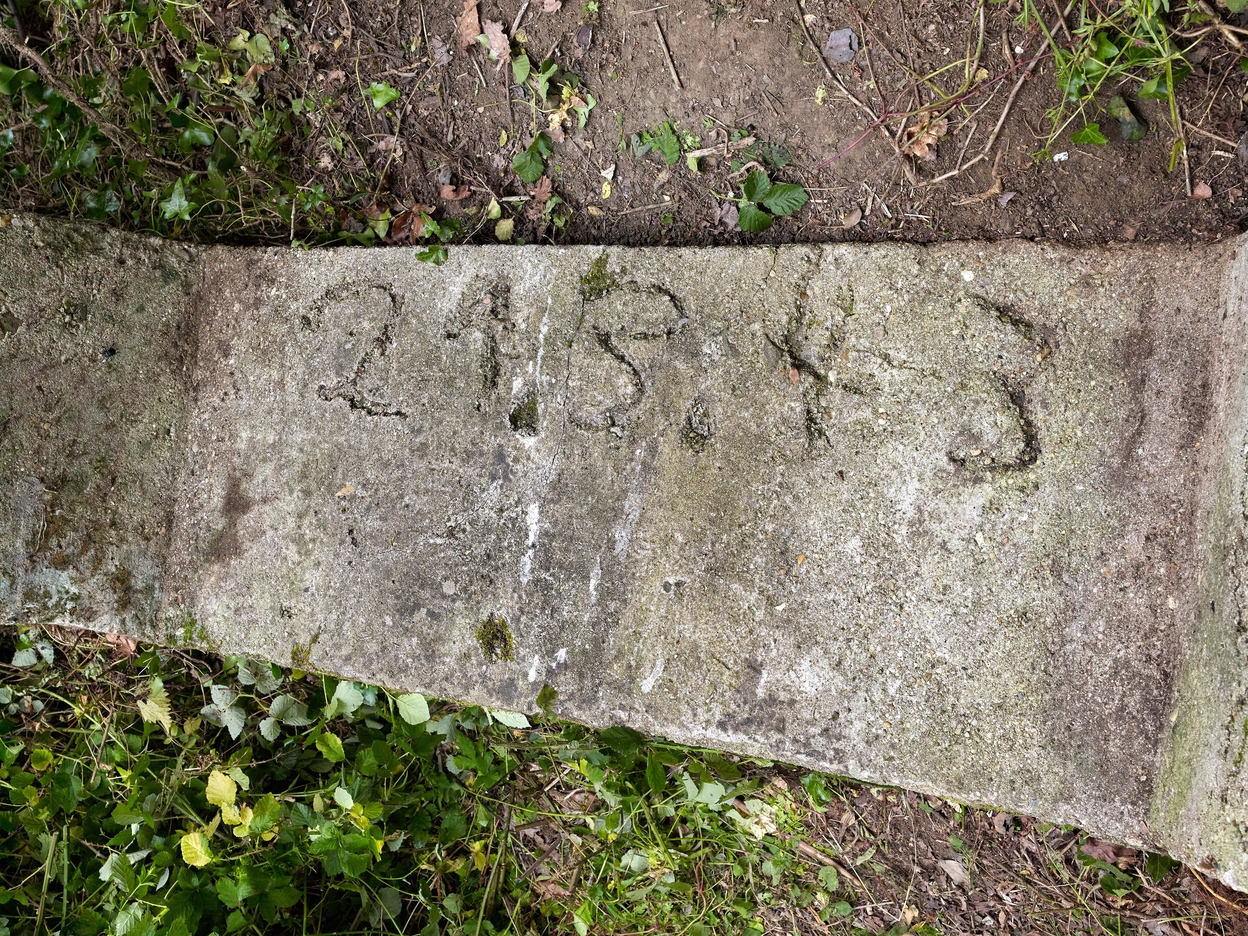 Vue du parapet du mur de clôture et de soutènement ceinturant le domaine : emplacement de tir situé à l'extrémité Est de la pointe près du bunker - casemate VF, date de construction dessinée dans le béton frais, 21.3.43Immatriculation