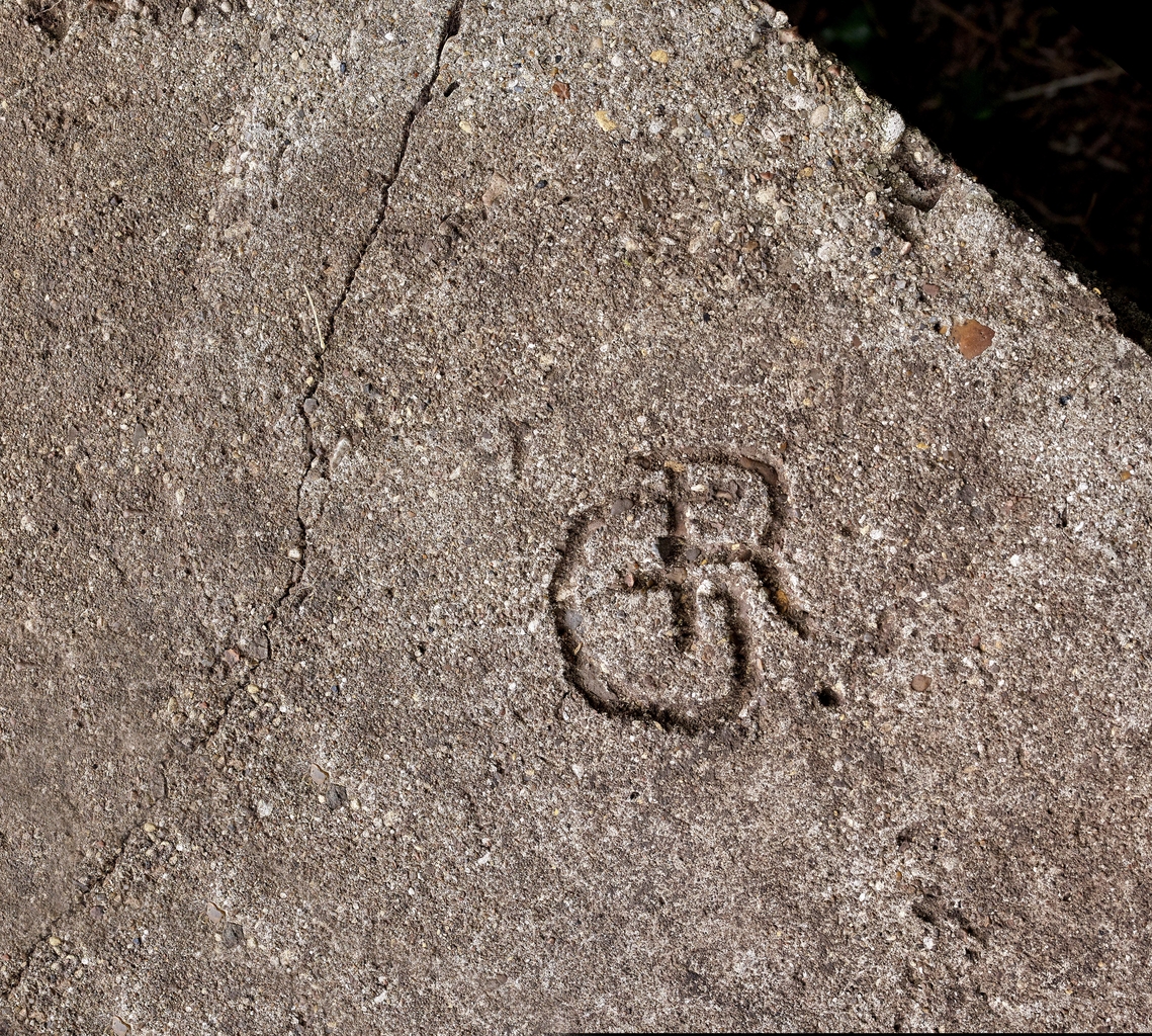 Vue du parapet du mur de clôture et de soutènement ceinturant le domaine : emplacement de tir situé à l'extrémité Est de la pointe près du bunker - casemate VF, inscription - acronyme dessinée dans le béton frais (initiales entrelacées GR pour Grenadier-Regiment, régiment de grenadier ?)Immatriculation