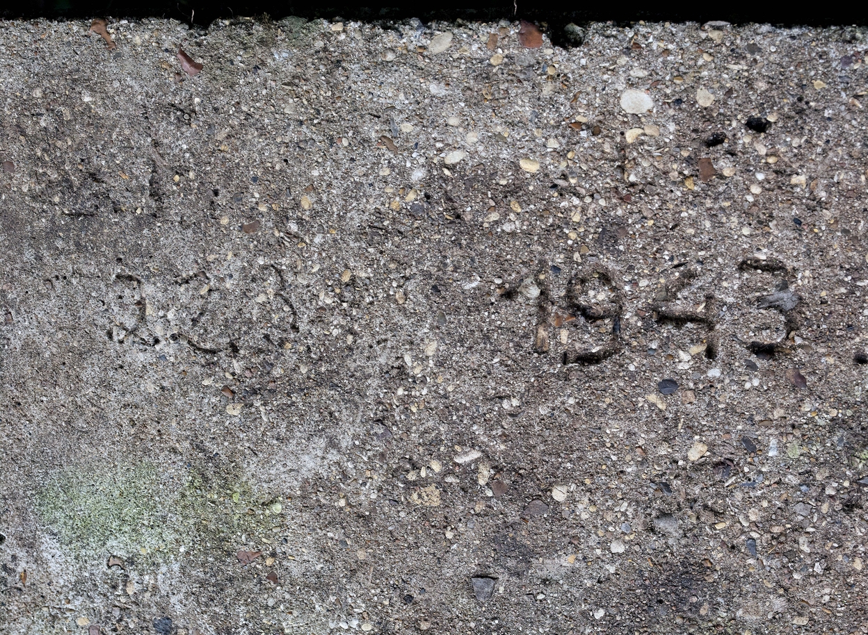 Vue du parapet du mur de clôture et de soutènement ceinturant le domaine : emplacement de tir situé à l'extrémité Est de la pointe près du bunker - casemate VF, date de construction dessinée dans le béton frais, 22.3.43Immatriculation
