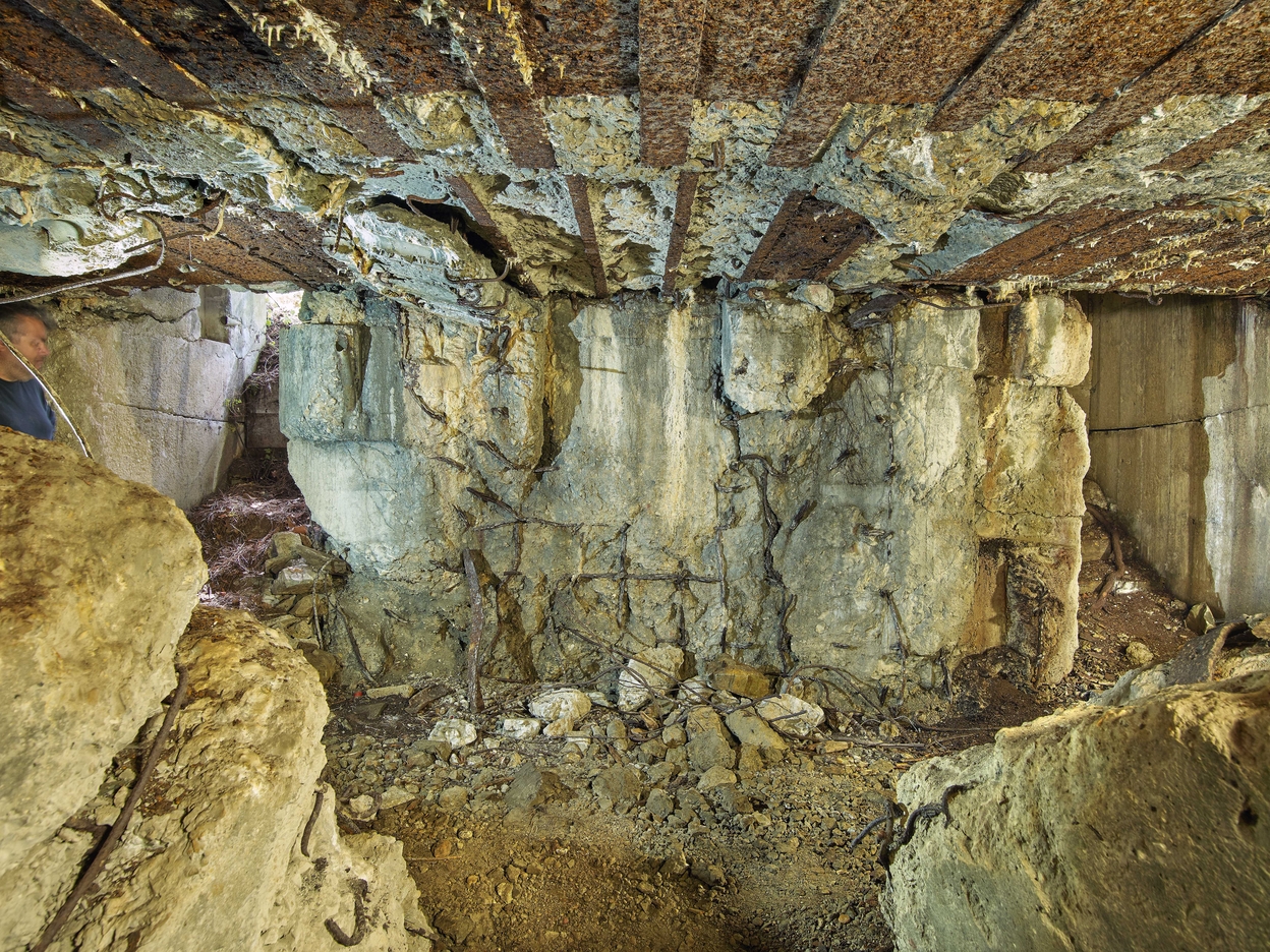 Vue du bunker - abri de type 502 situé à l'extrémité Est de la pointe : sas après explosion. De part et d'autre du sas se trouvent les entrées du bunker. Au centre, le ferraillage du bunker est particulièrement visible du fait de l'explosionImmatriculation