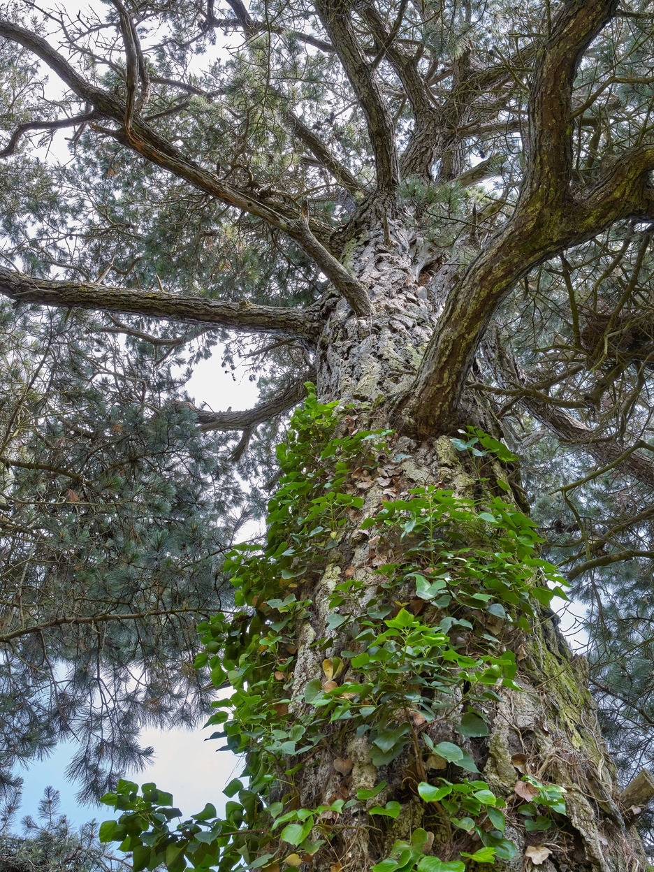 Vue du pin de Monterey (Pinaceae) ayant servi de poste d'observation : cime de l'arbre depuis le solImmatriculation