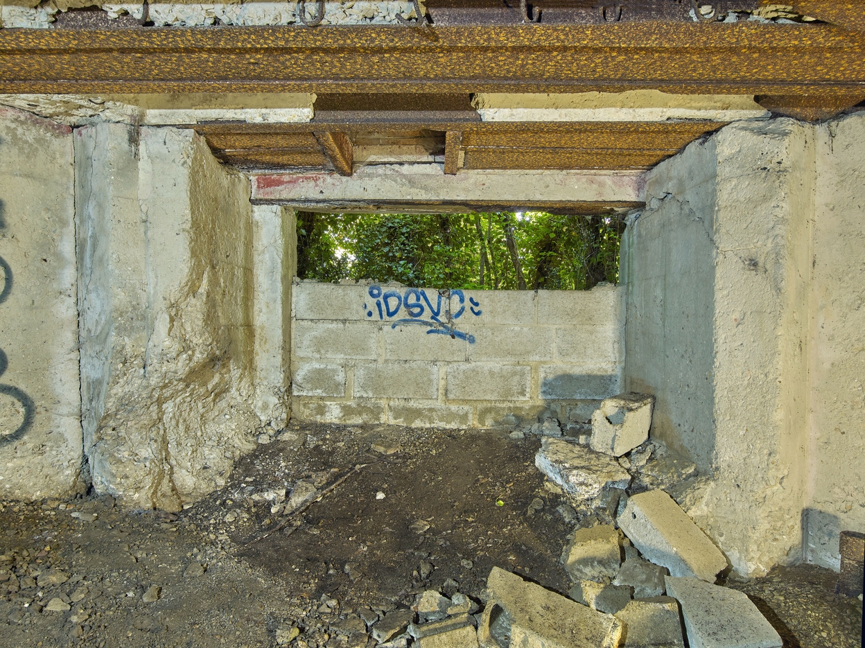 Vue de la chambre de tir (vers l'embrasure) : au centre, embrasure rectangulaire (partiellement murée par des parpaings) ; au plafond, emplacements des bouches d'aspiration des fumées de tir. La chambre de tir semble avoir subi une explosion interneImmatriculation