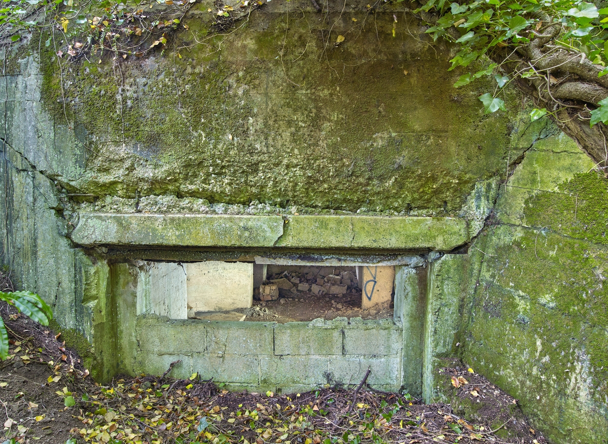 Vue du bunker - casemate de type 680 pour un canon de 7,5 cm ou 7,62 cm situé au Sud : embrasure (photographiée de l'extérieur). L'embrasure est partiellement murée par des parpaingsImmatriculation