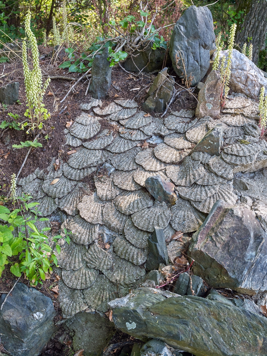 Vue de la couverture de la grotte artificielle (faisant abri pour un ou des animaux) du bassin : elle est ornée de coquilles Saint-Jacques en ciment et de rocailleImmatriculation
