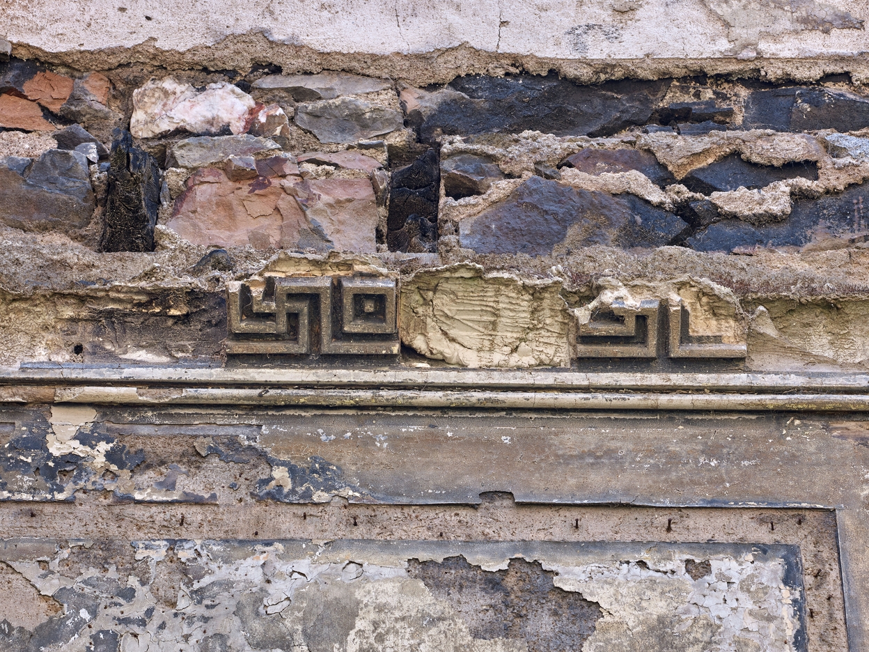 Vue intérieure : salle située au Sud-ouest, vestiges d'une frise de style greco-romain en staff (plâtre) et traces de boiseriesImmatriculation