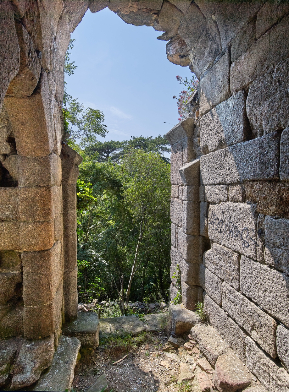 Vue du rez-de-chaussée surélevé : passage d'entrée du pont-levis vers l'Ouest. De part et d'autre, départ d'arc de la porteImmatriculation