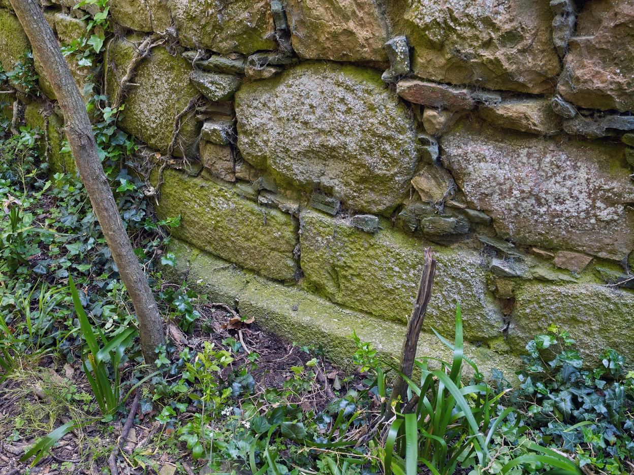 Vue du parement à l'Est. Un bandeau continu et une assise en pierre de taille marquent la différence entre la tour (verticale) et le pied de la tour (avec fruit). Ils sont ici semi-enterrésImmatriculation