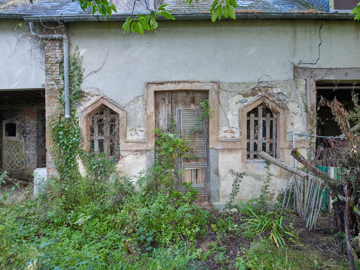 Vue des communs et dépendances : élévation sud, écurie Ouest. A signaler, la forme triangulaire des fenêtres encadrant la porte rectangulaire ; le jeu de couleur entre granite gris, brique et enduitsImmatriculation