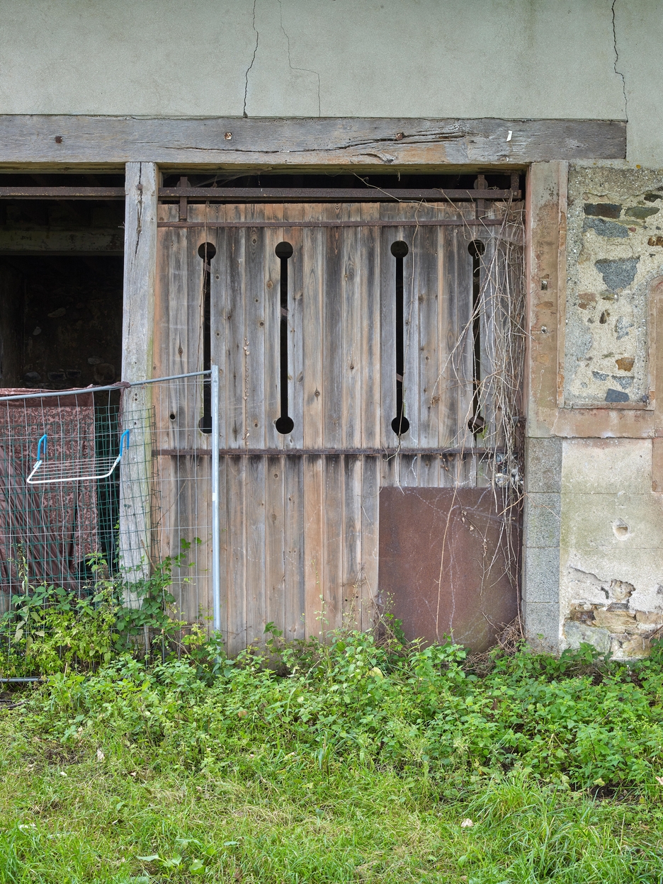 Vue des communs et dépendances : élévation sud, porte ajourée en bois de la remise. A signaler, linteau et poteau en bois de la remise ; enduit ciment en partie hauteImmatriculation