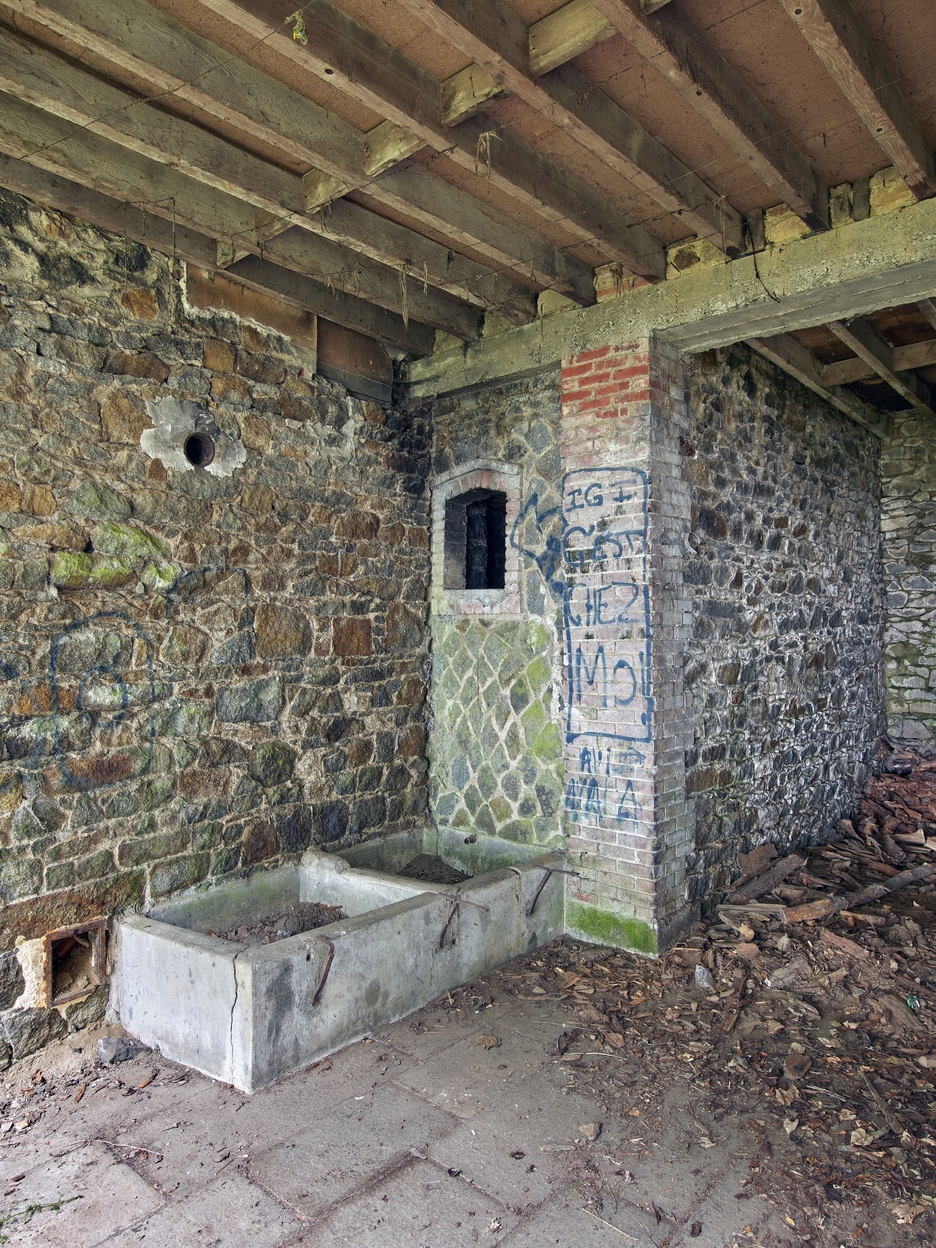 Vue de l'intérieur des communs et dépendances : double bassin en ciment armé alimenté par un tuyau et citerne maçonnée (regard entouré de brique et appareillage polygonal). A signaler : linteau en béton armé soutenant les poutres du plancher du combleImmatriculation