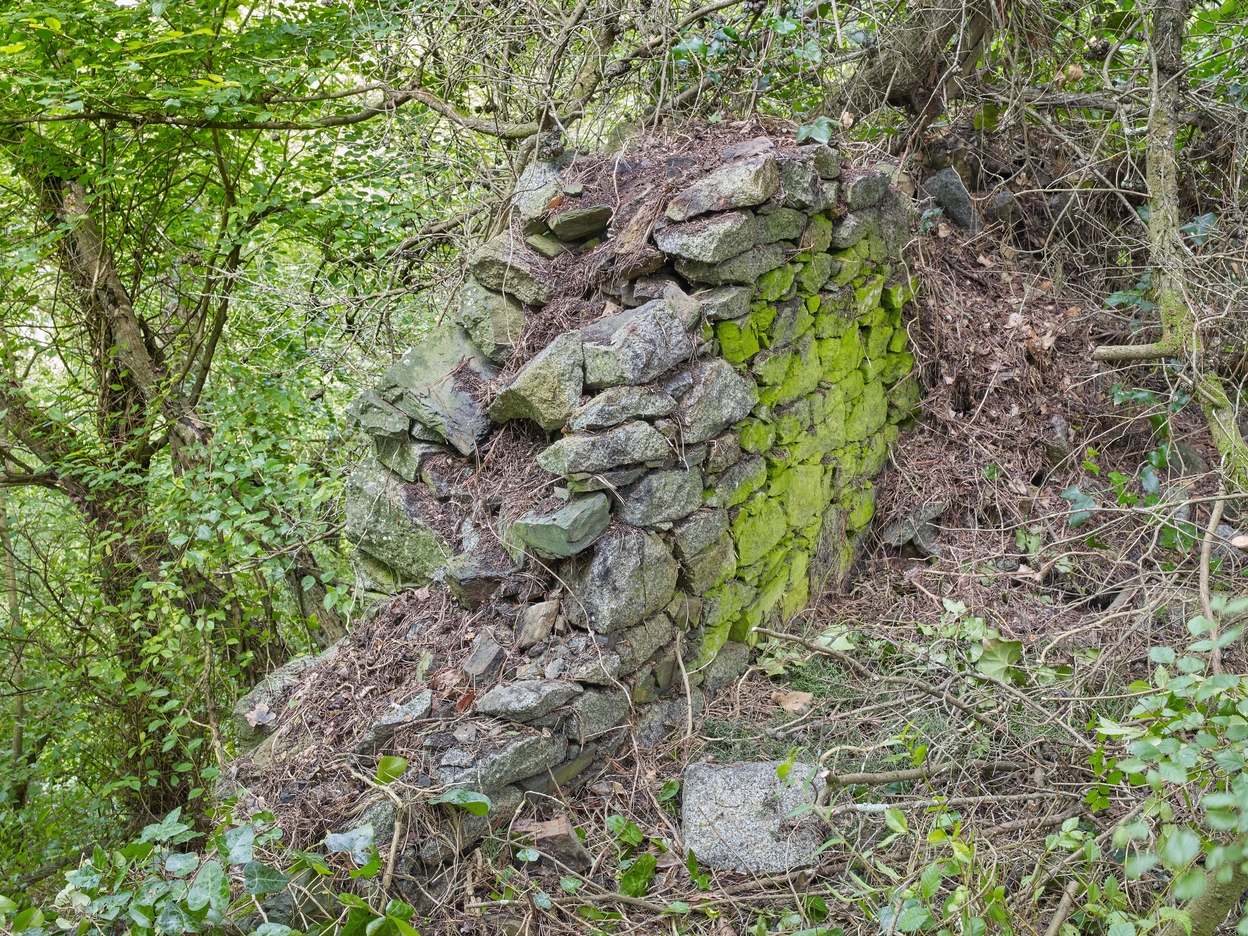 Vue du parapet du mur de soutènement au Nord côté Gouët : appareillage de moellon de granite (au niveau de la base du sol, 0,9 à 1 mètre d'épaisseur ; au plus haut, 0,6 mètre d'épaisseur)Immatriculation